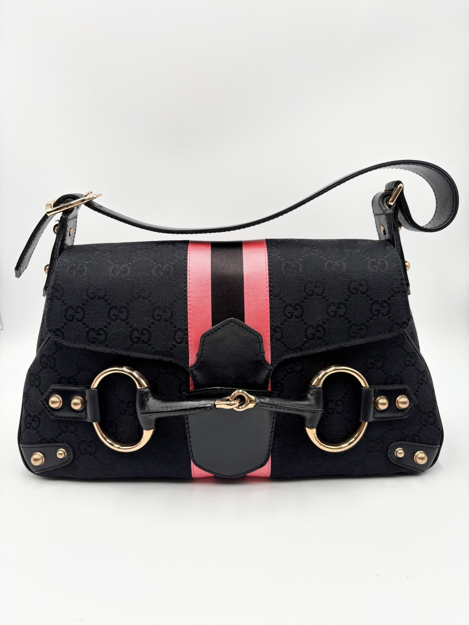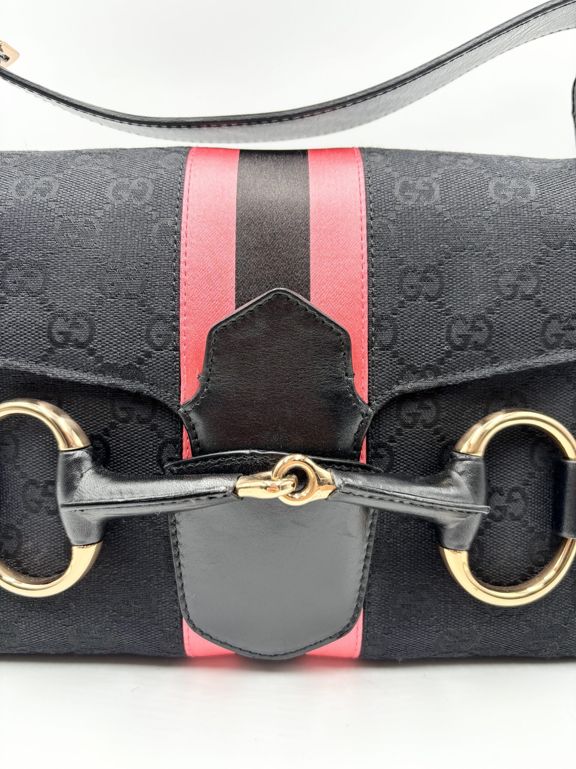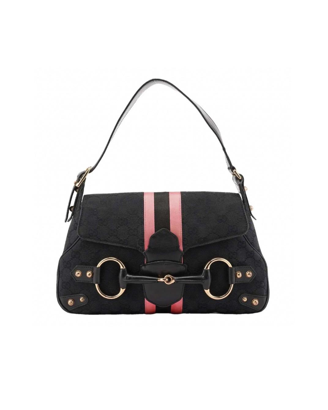 GUCCI Horsebit shoulder bag in black fabric and leather. Decorative pink/black/pink web stripe.