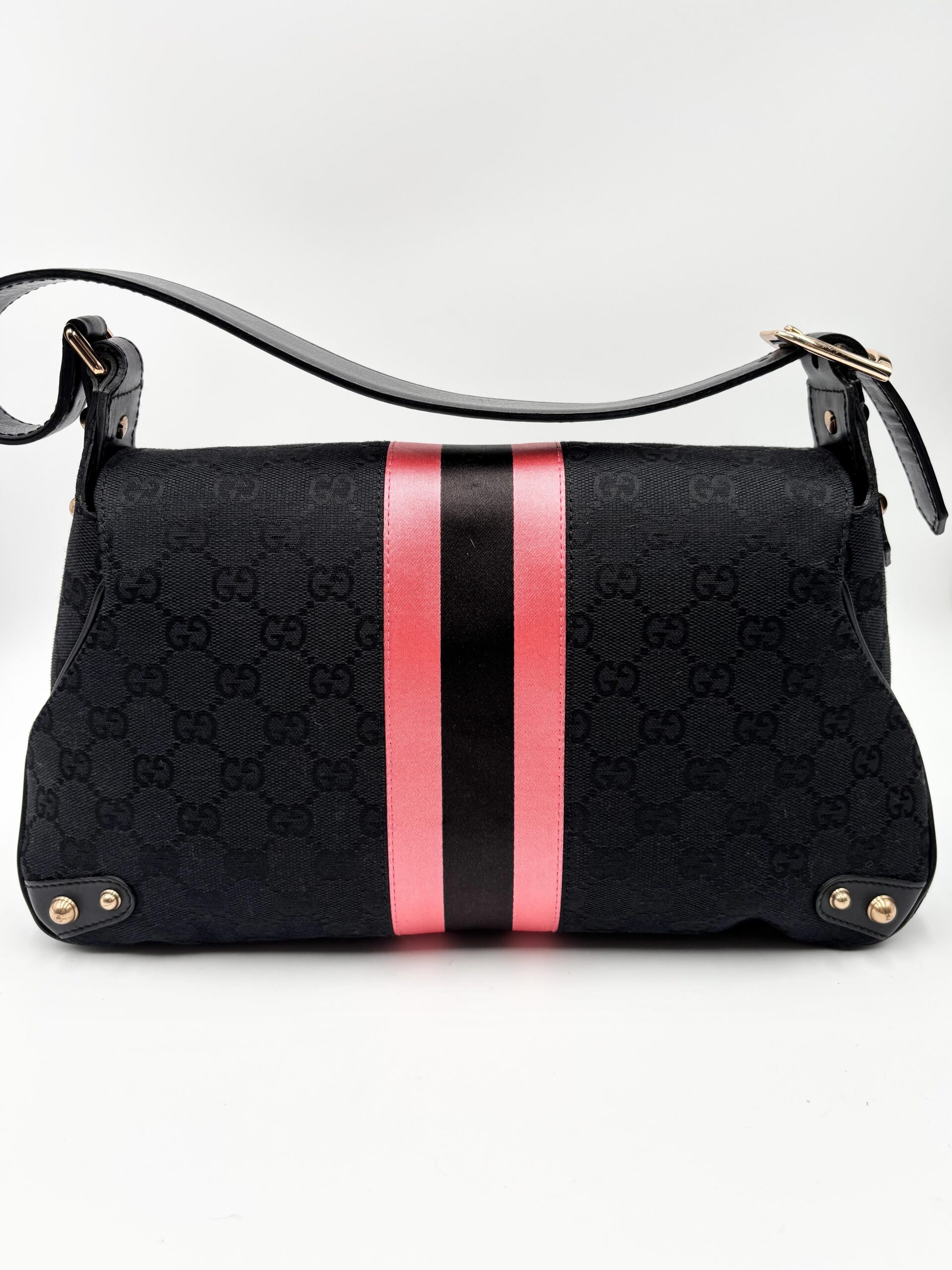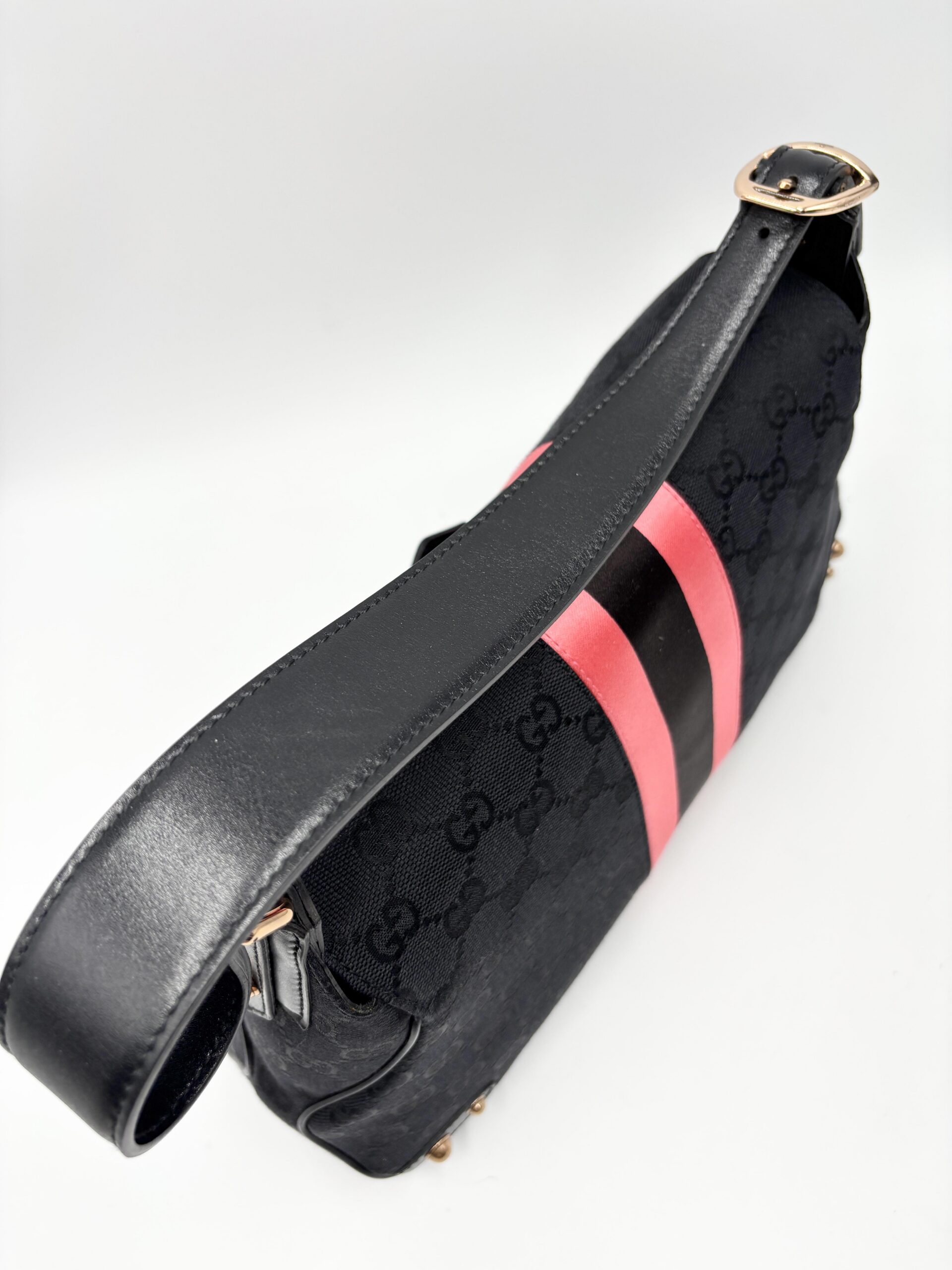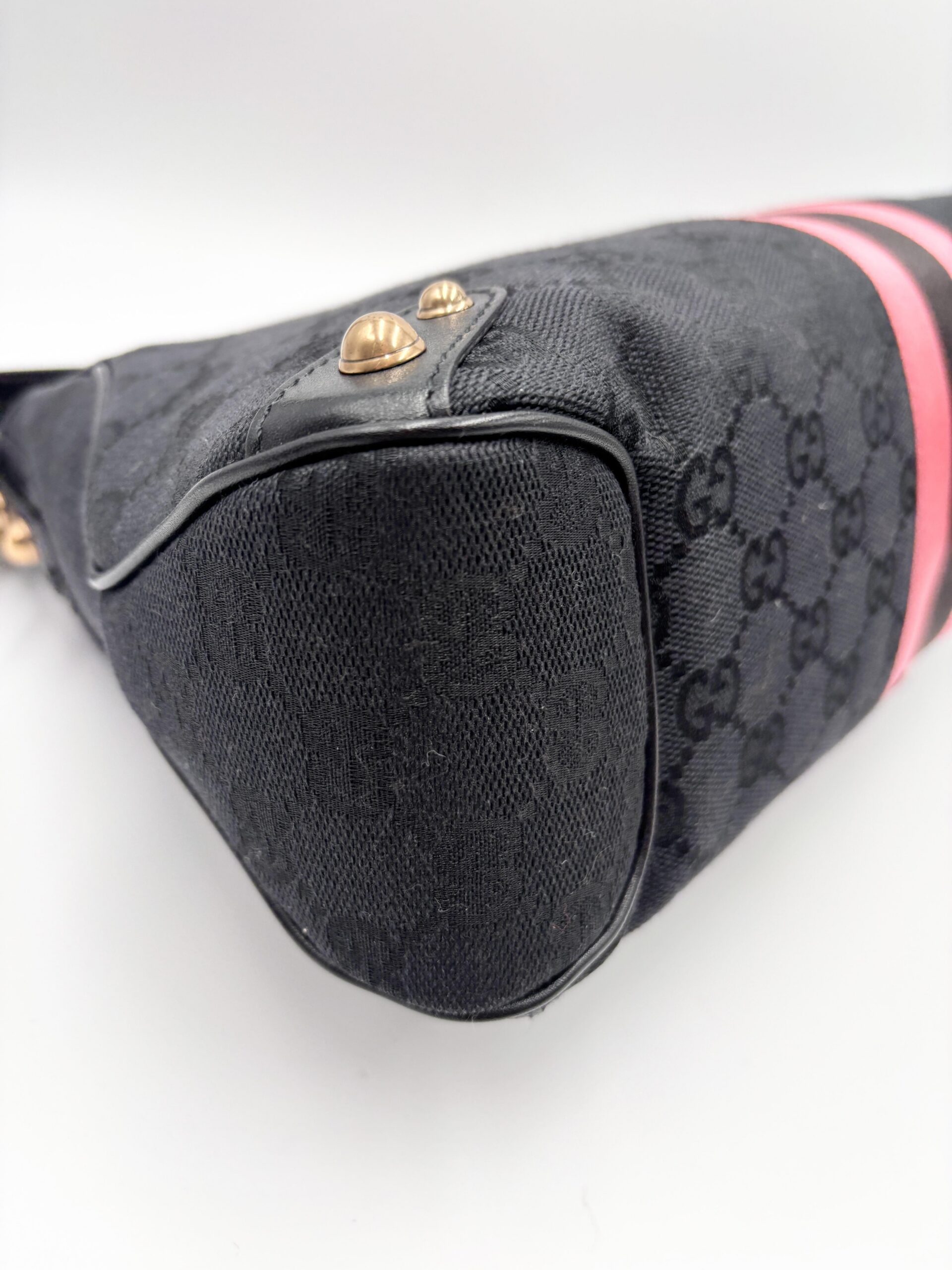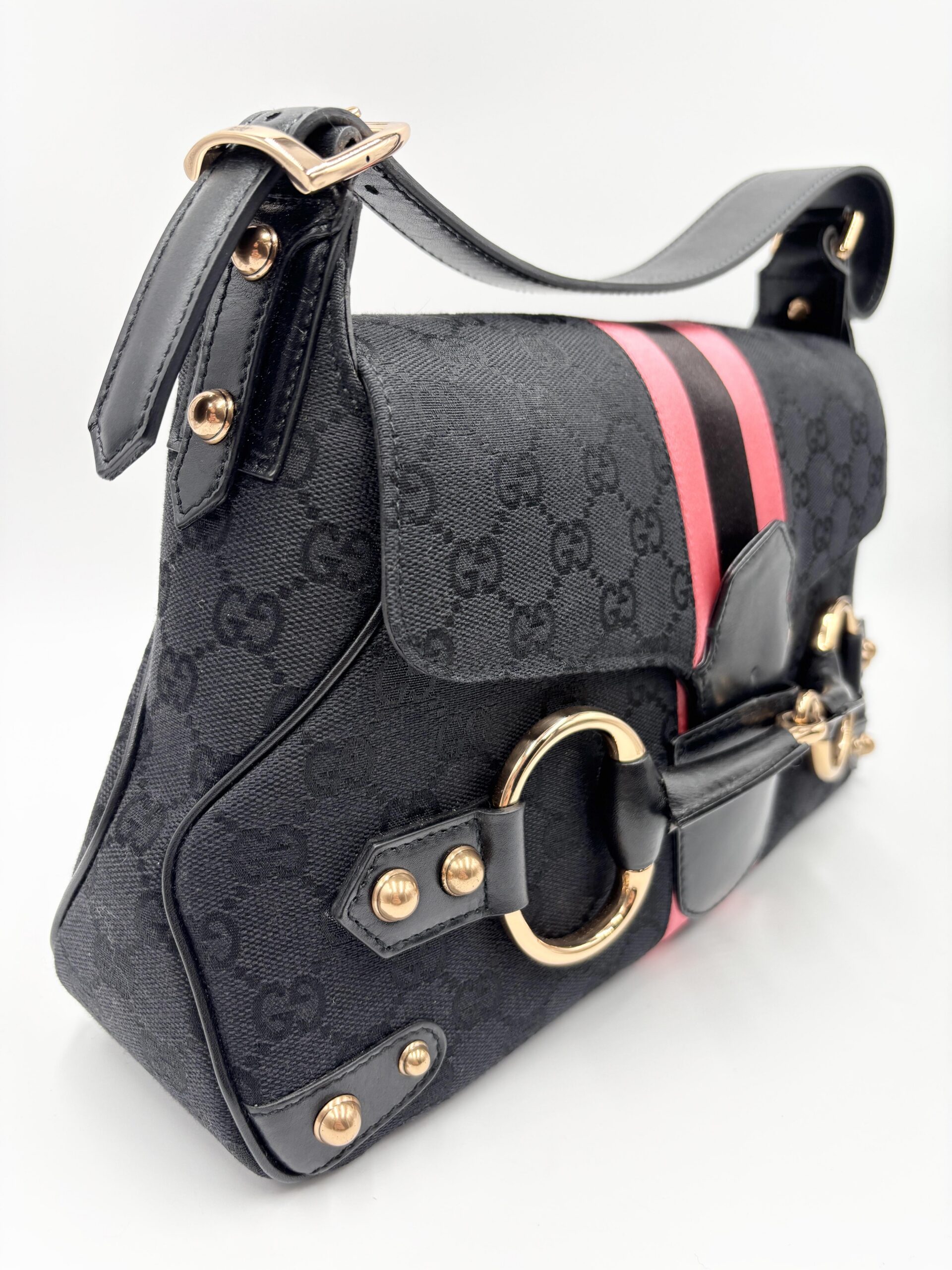 GUCCI Horsebit shoulder bag in black fabric and leather. Decorative pink/black/pink web stripe.