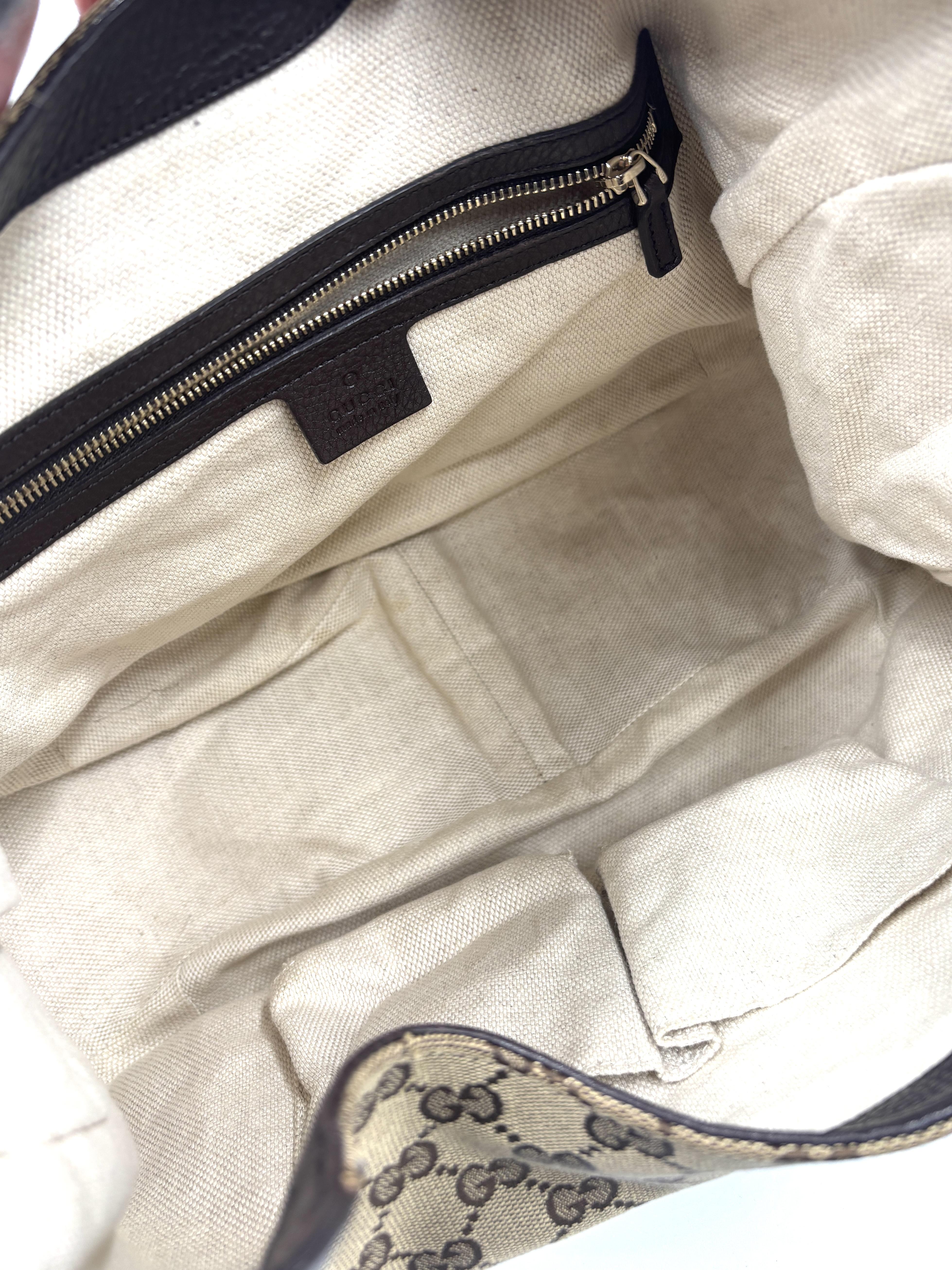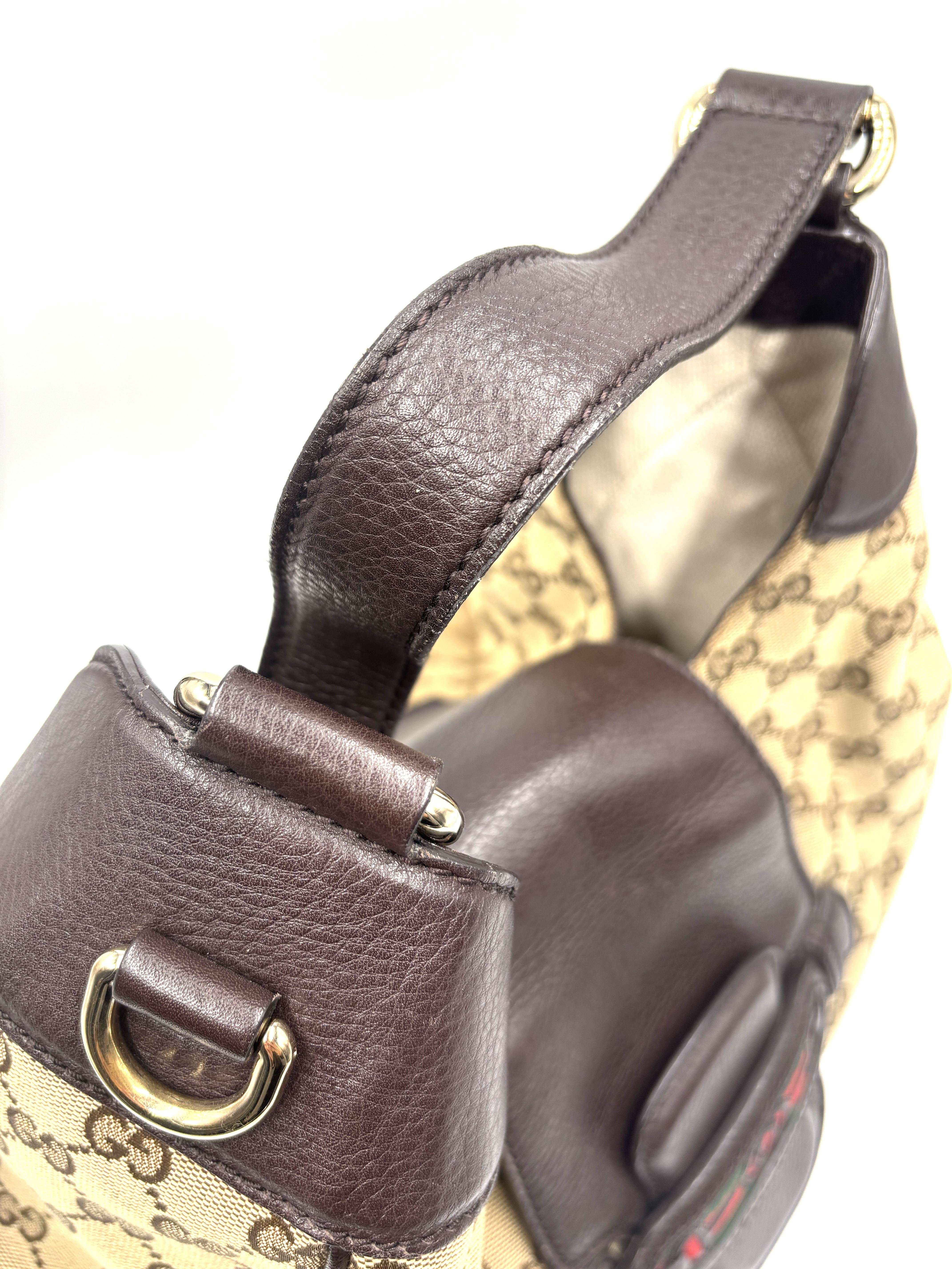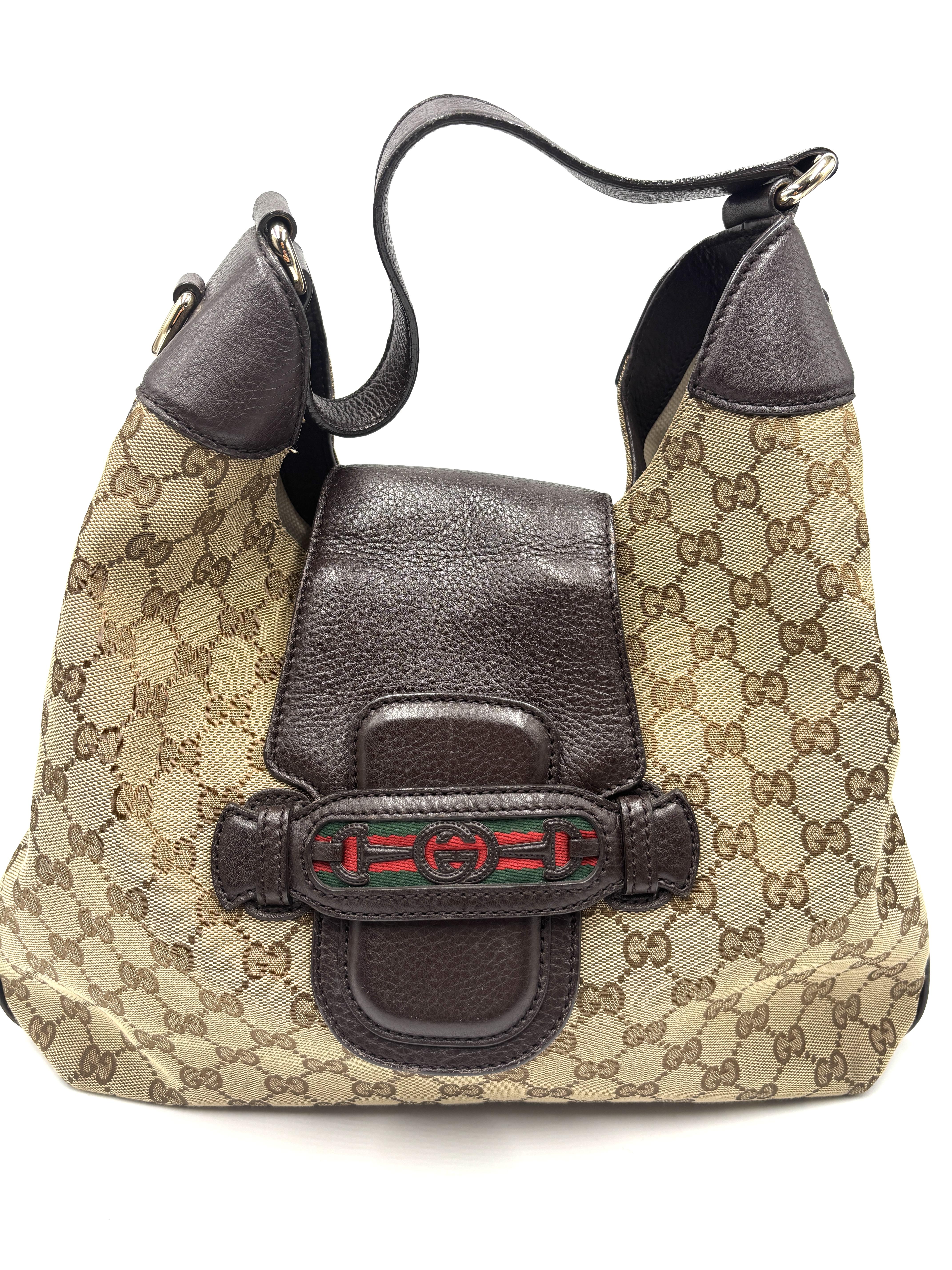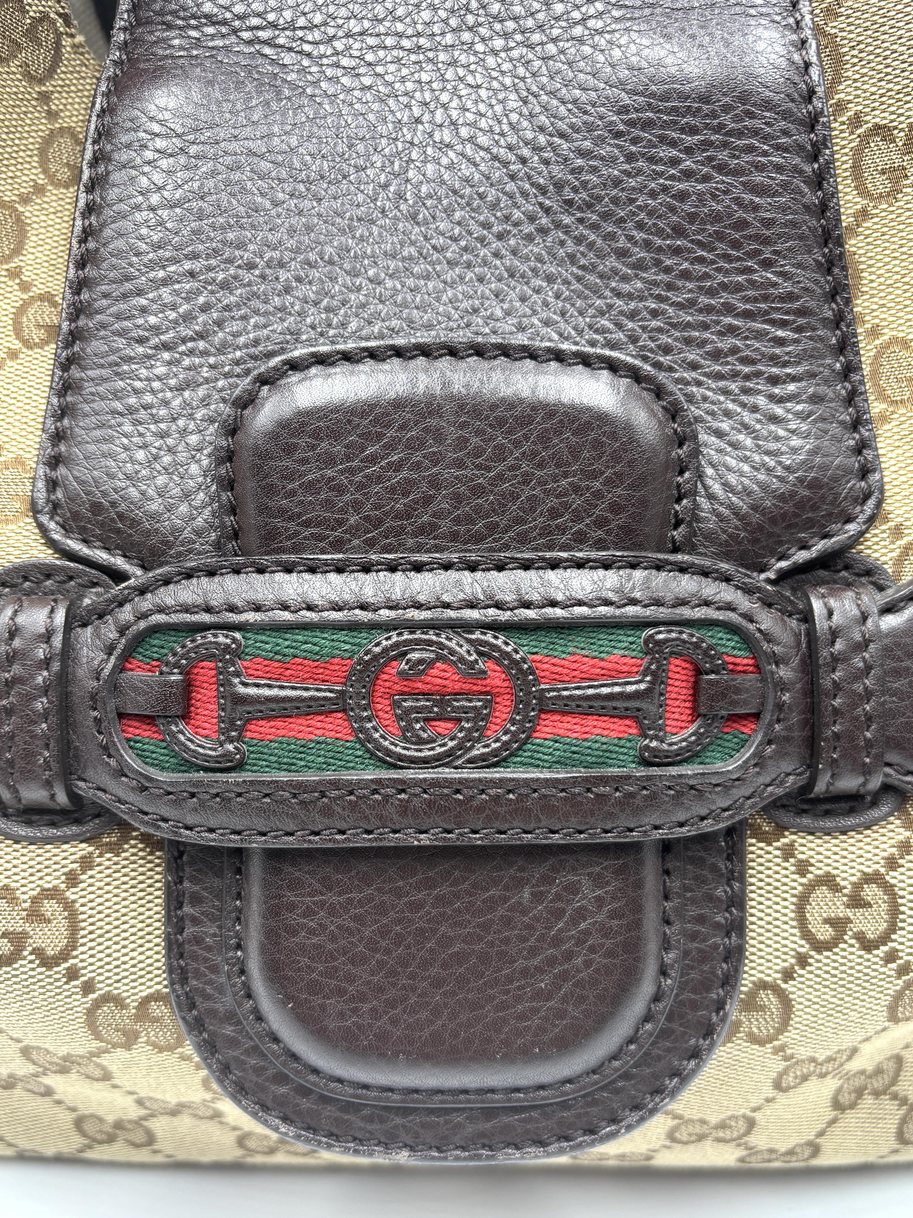 GUCCI shoulder bag with flap closure. Brown leather handles and flap, complete with shoulder strap.