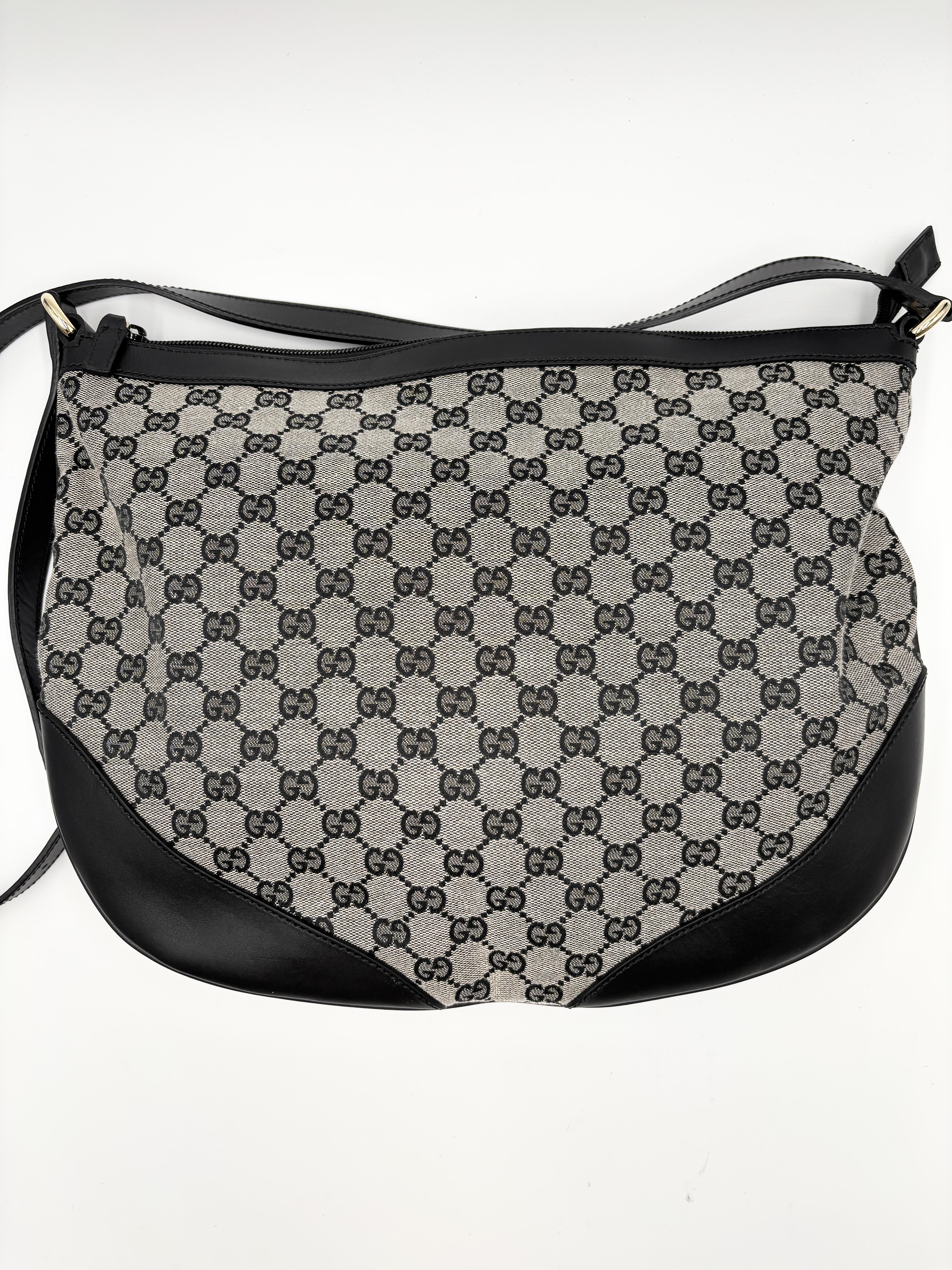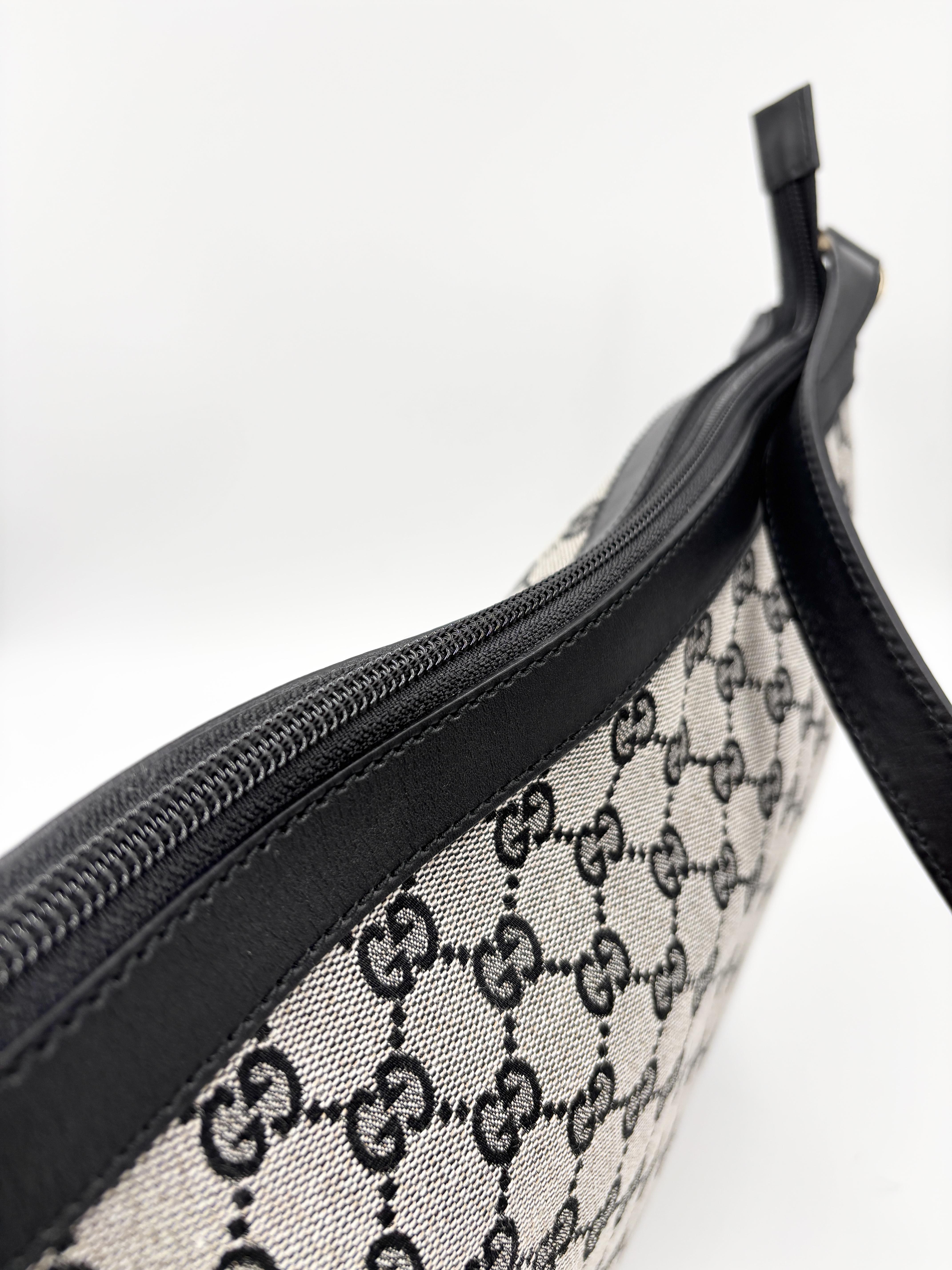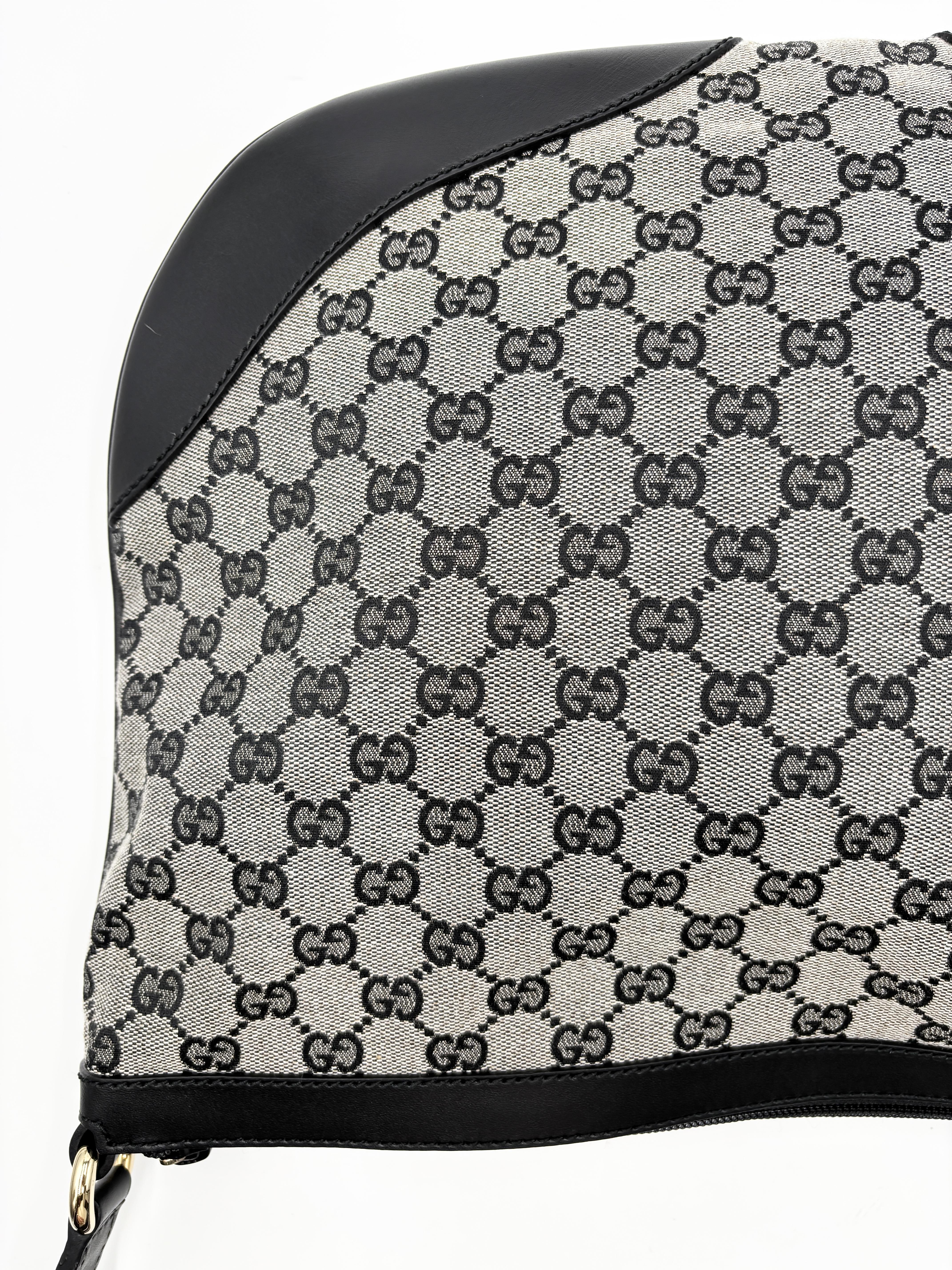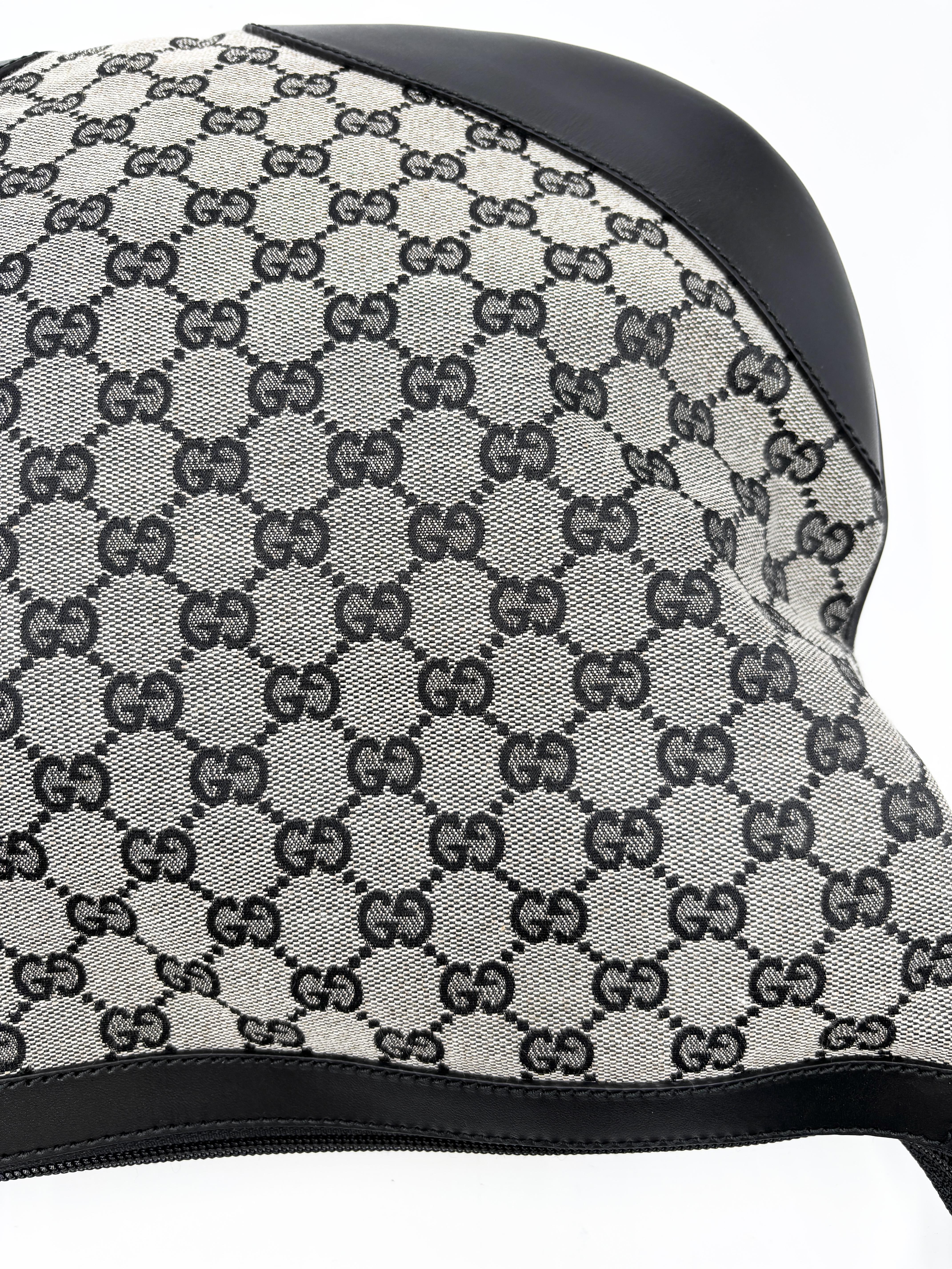 GUCCI shoulder bag in black and grey monogram fabric with black leather details