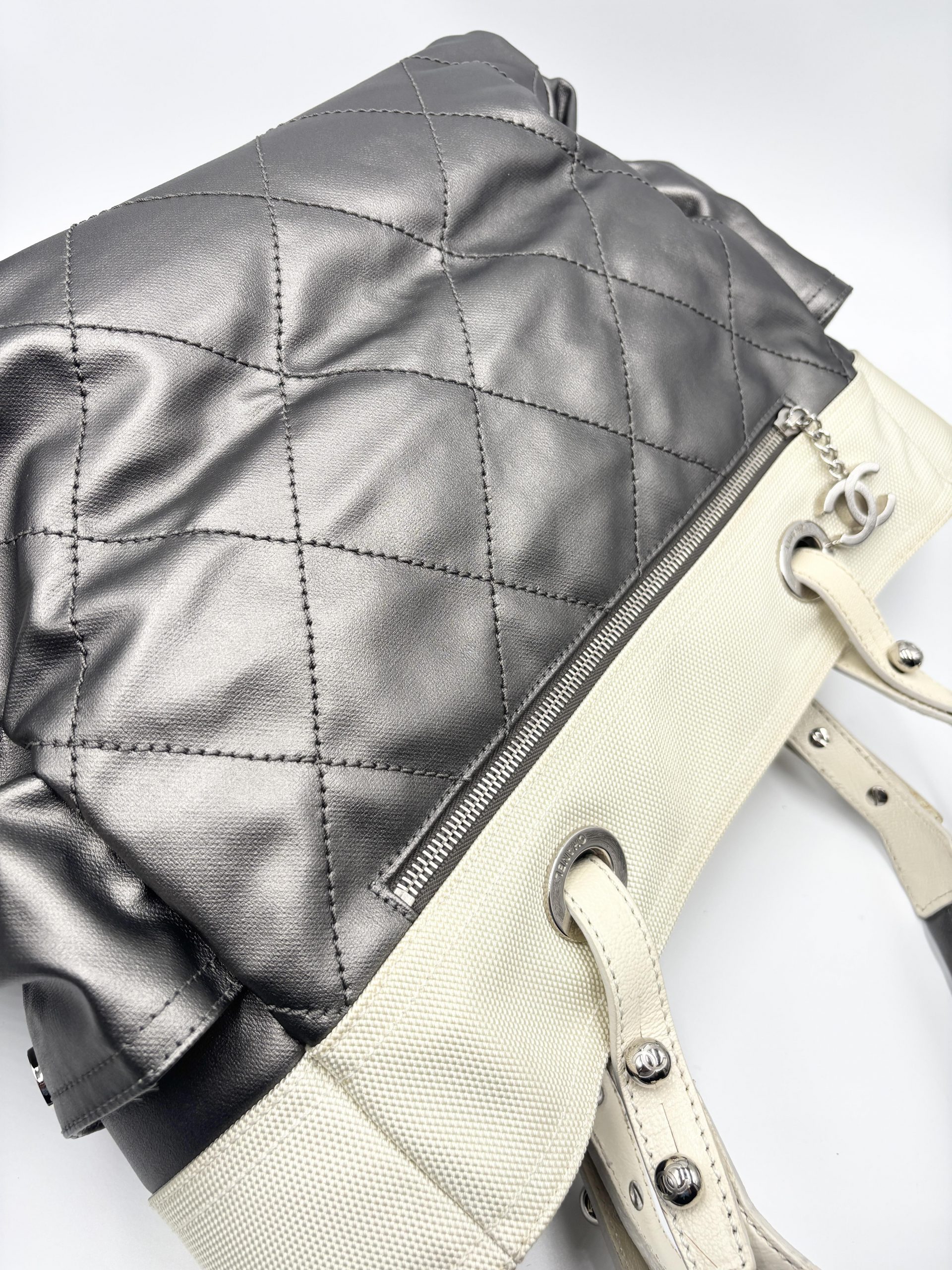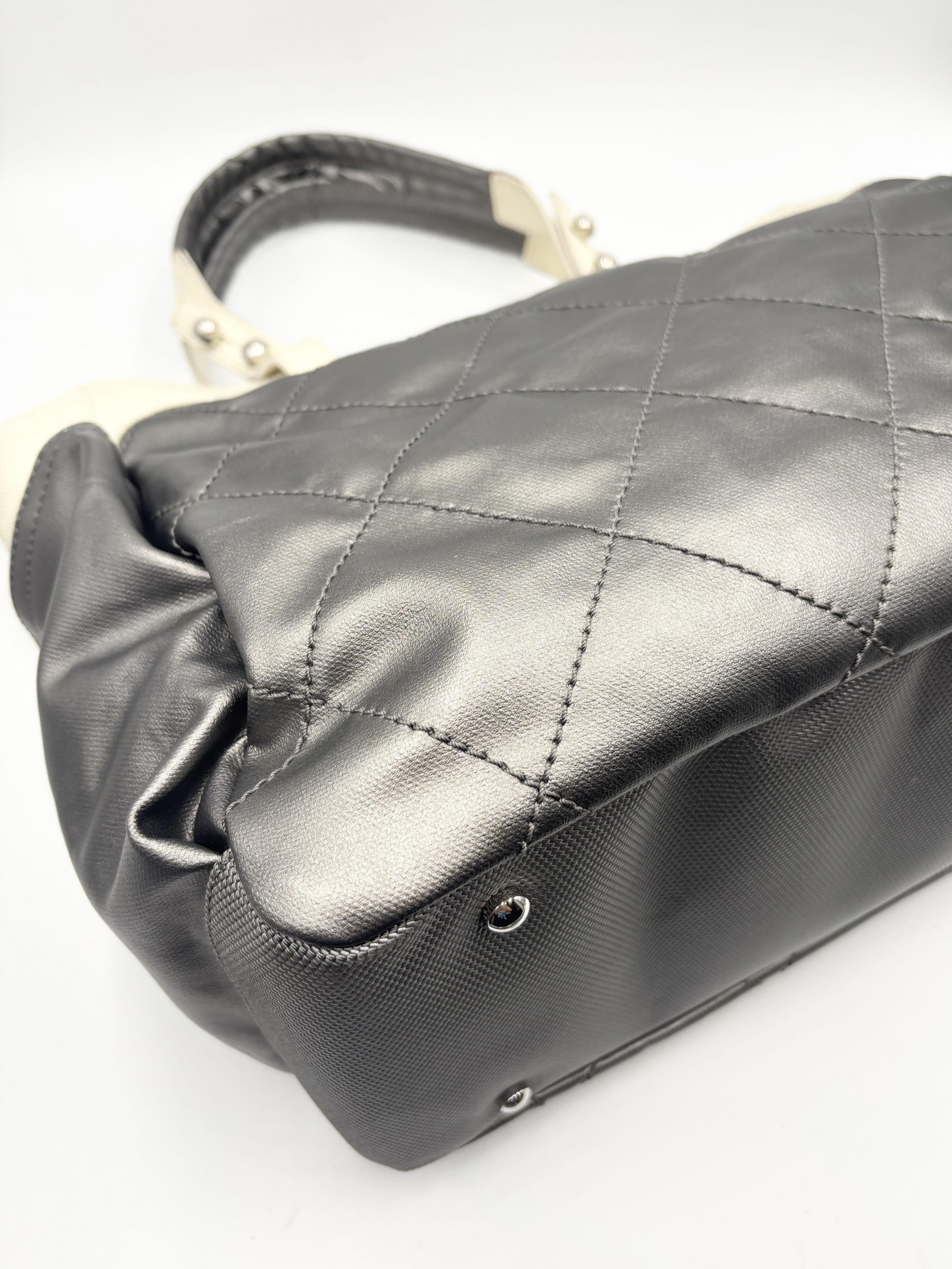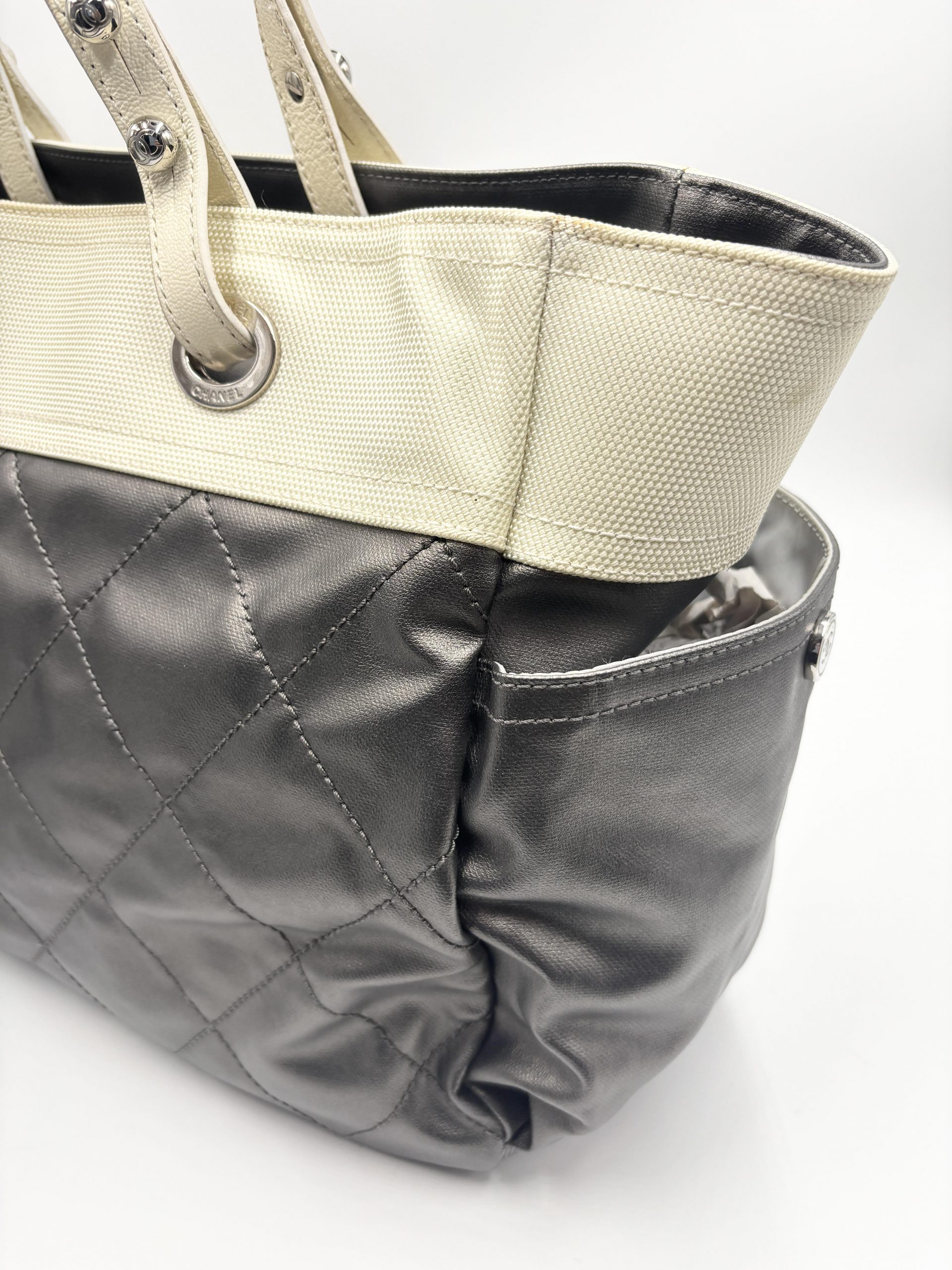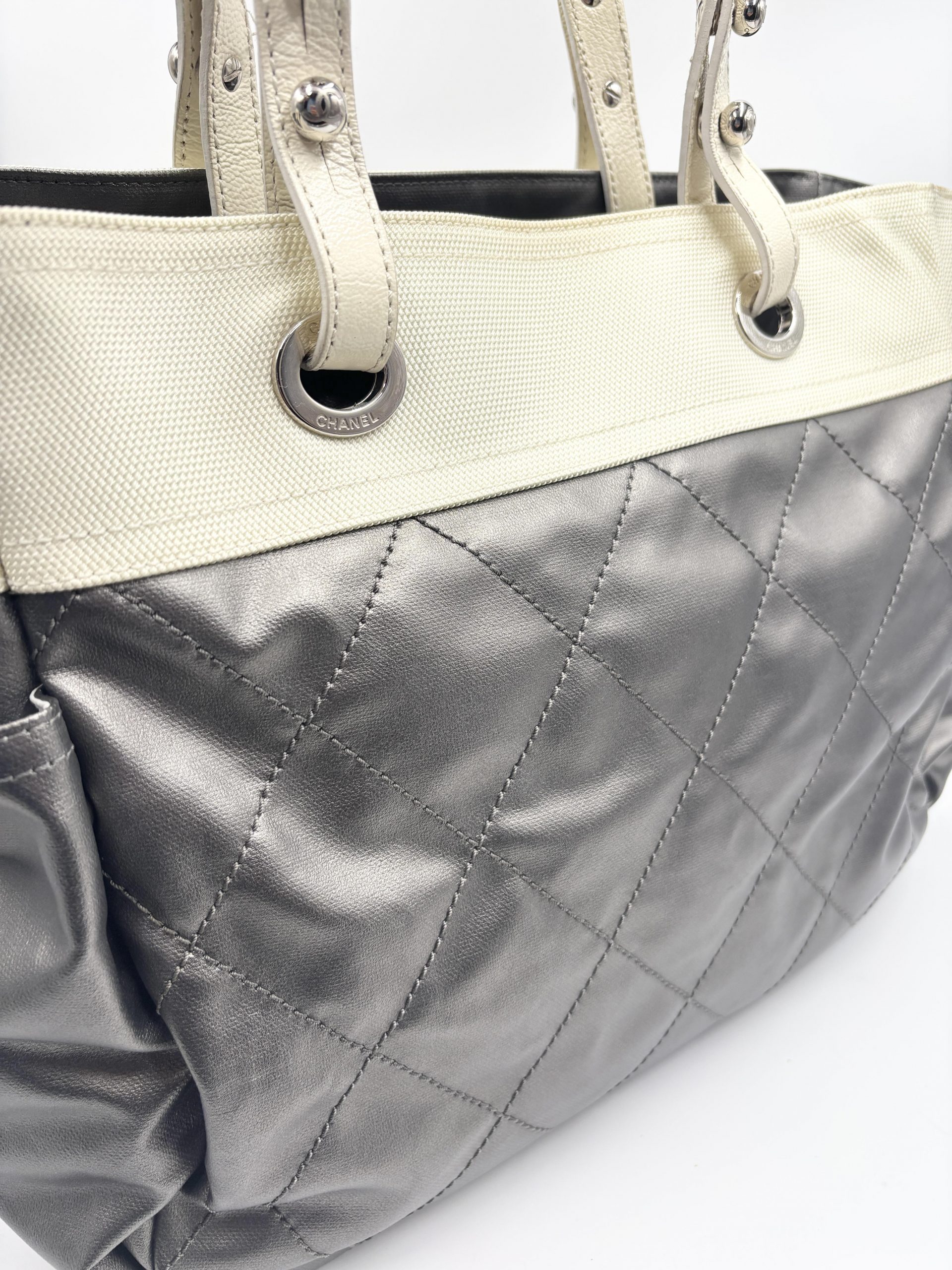 CHANEL shopping Paris – Biarritz in pelle grigio metal e tessuto avorio