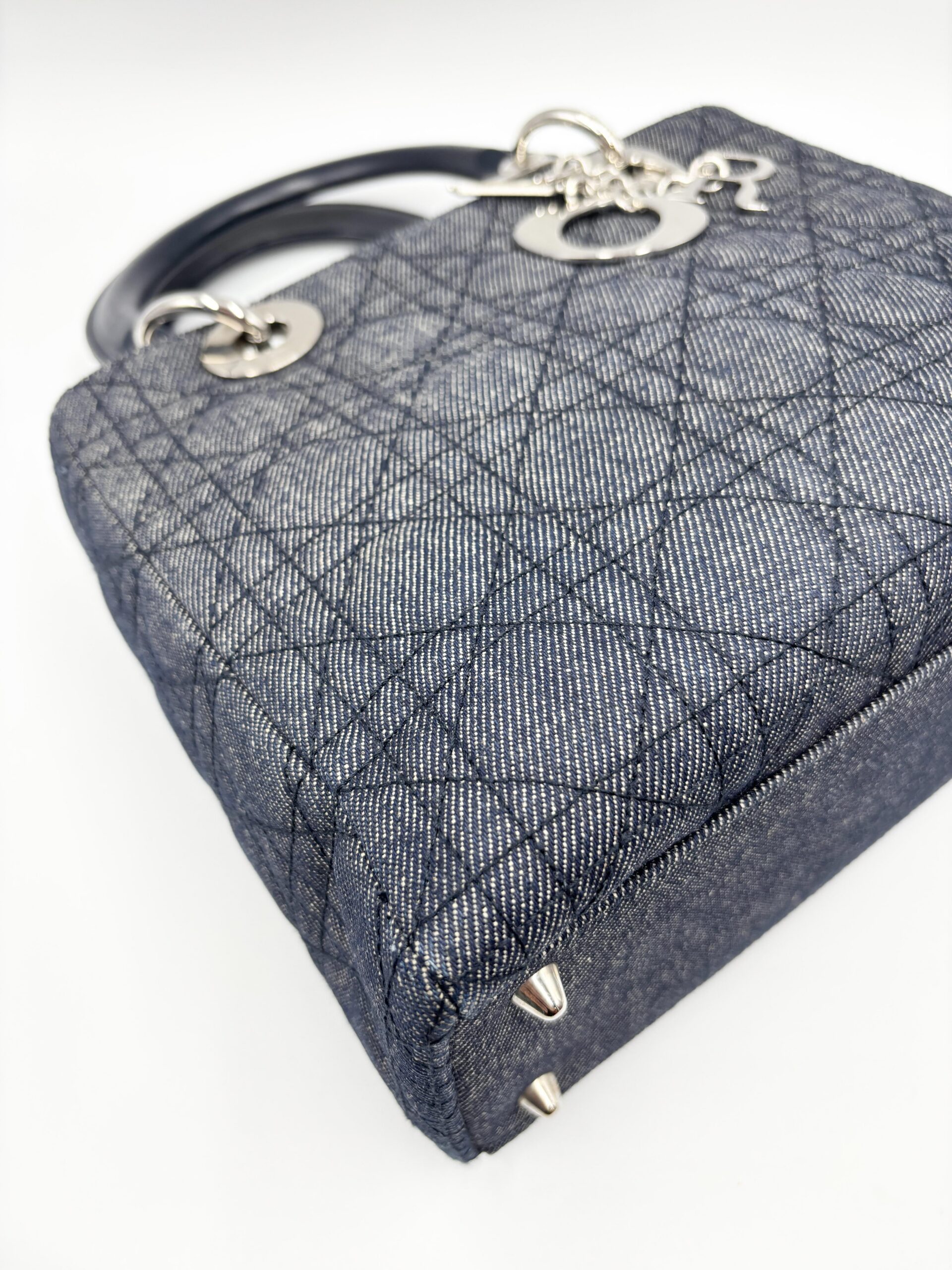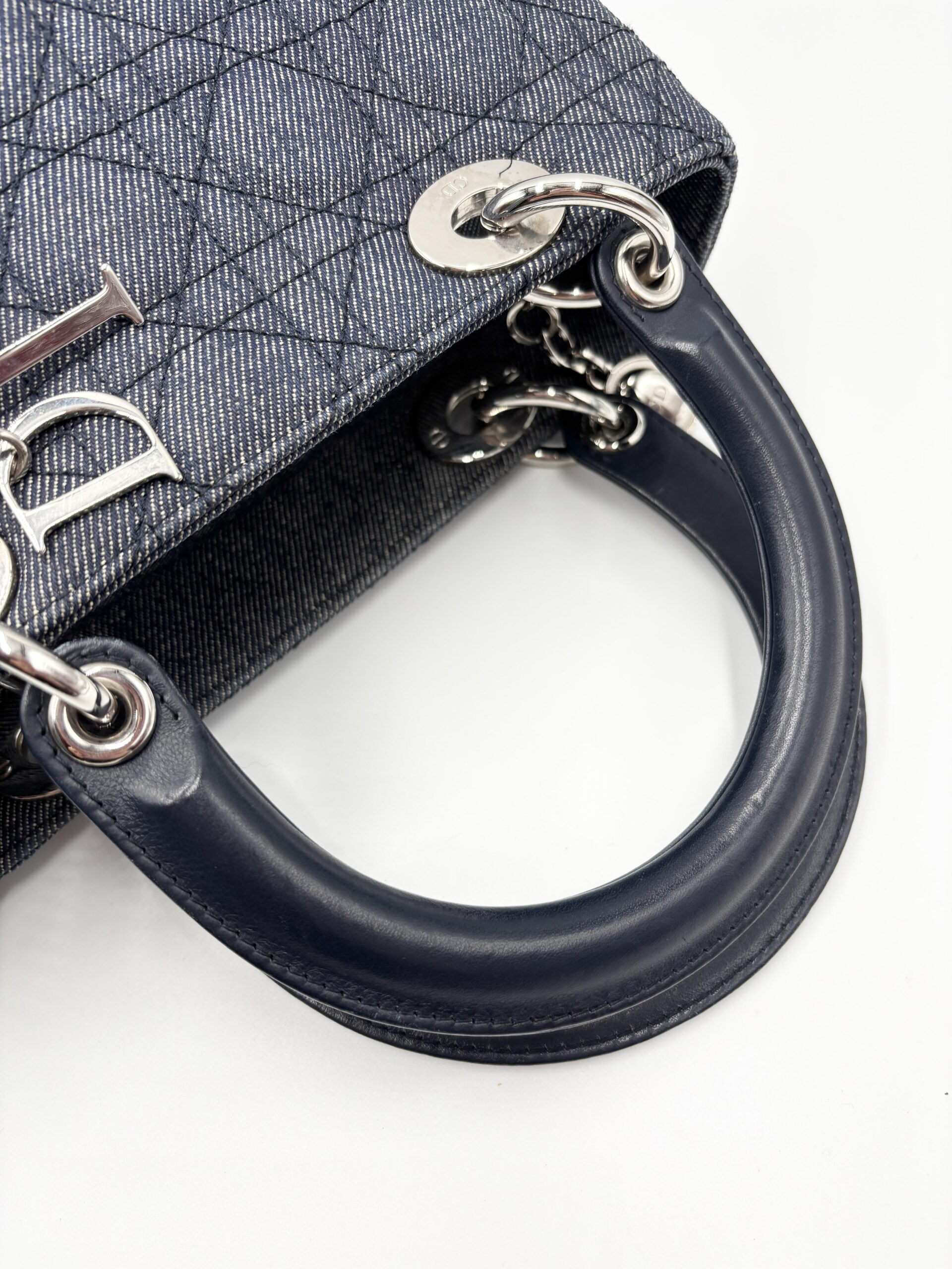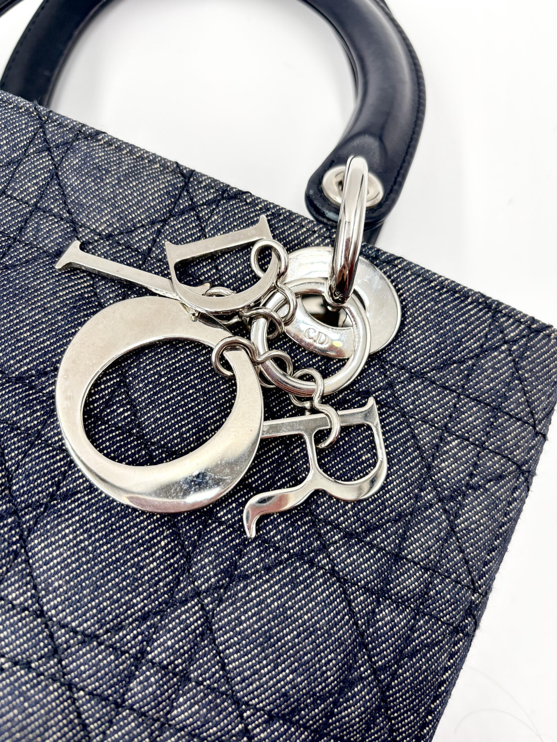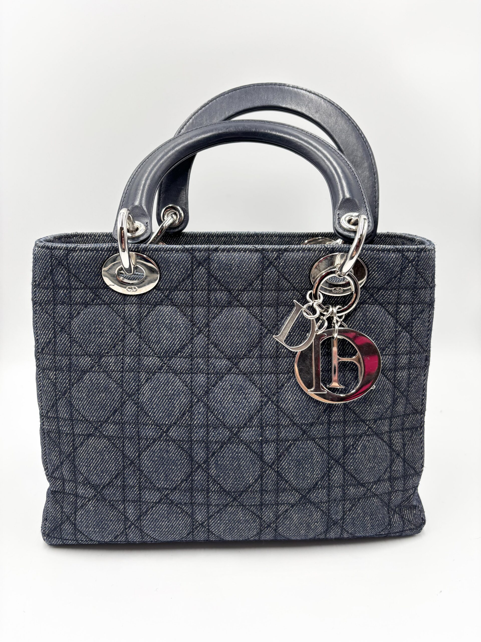 DIOR Lady medium in denim blu/grigio con finiture in pelle blu scuro.