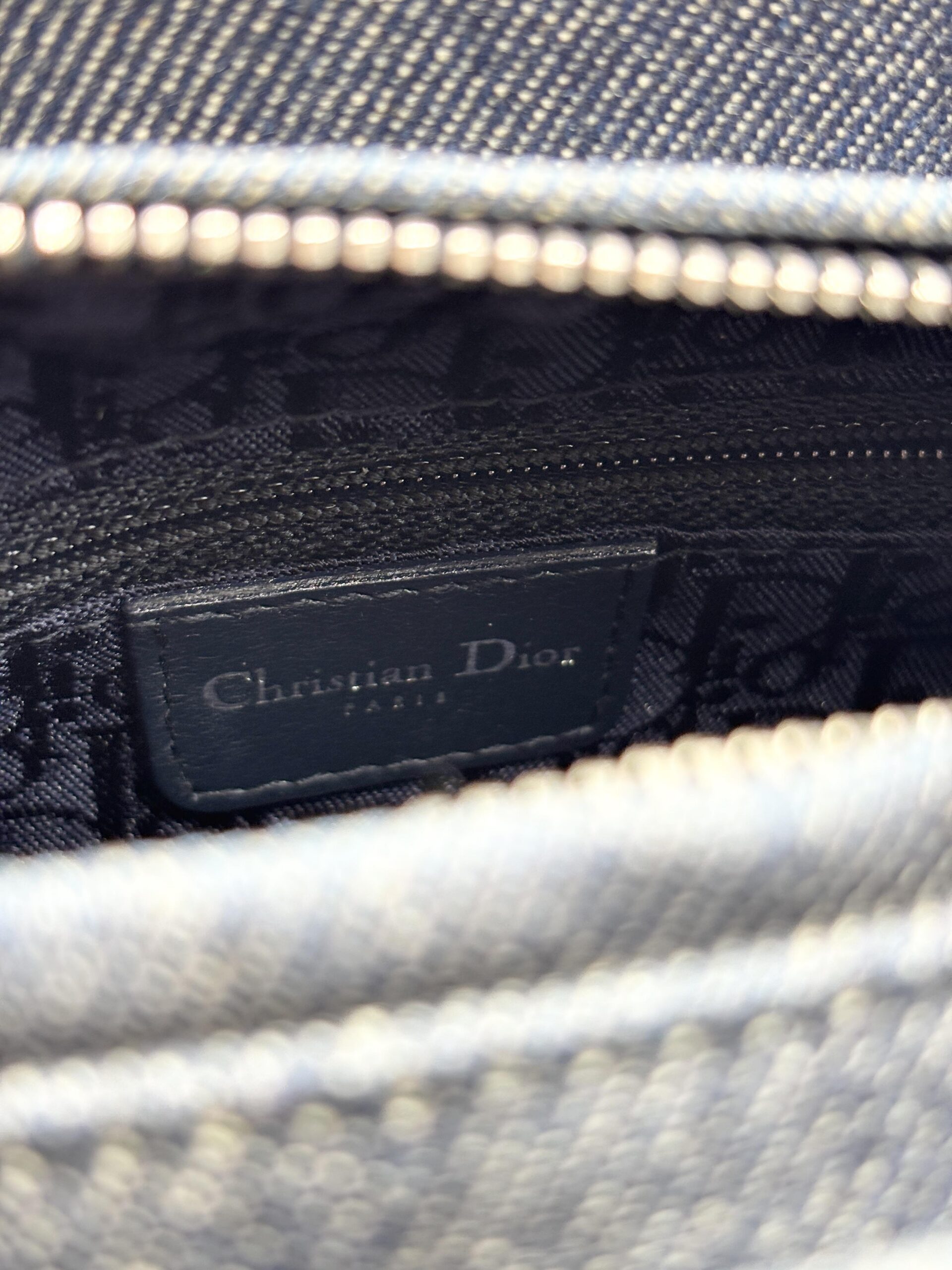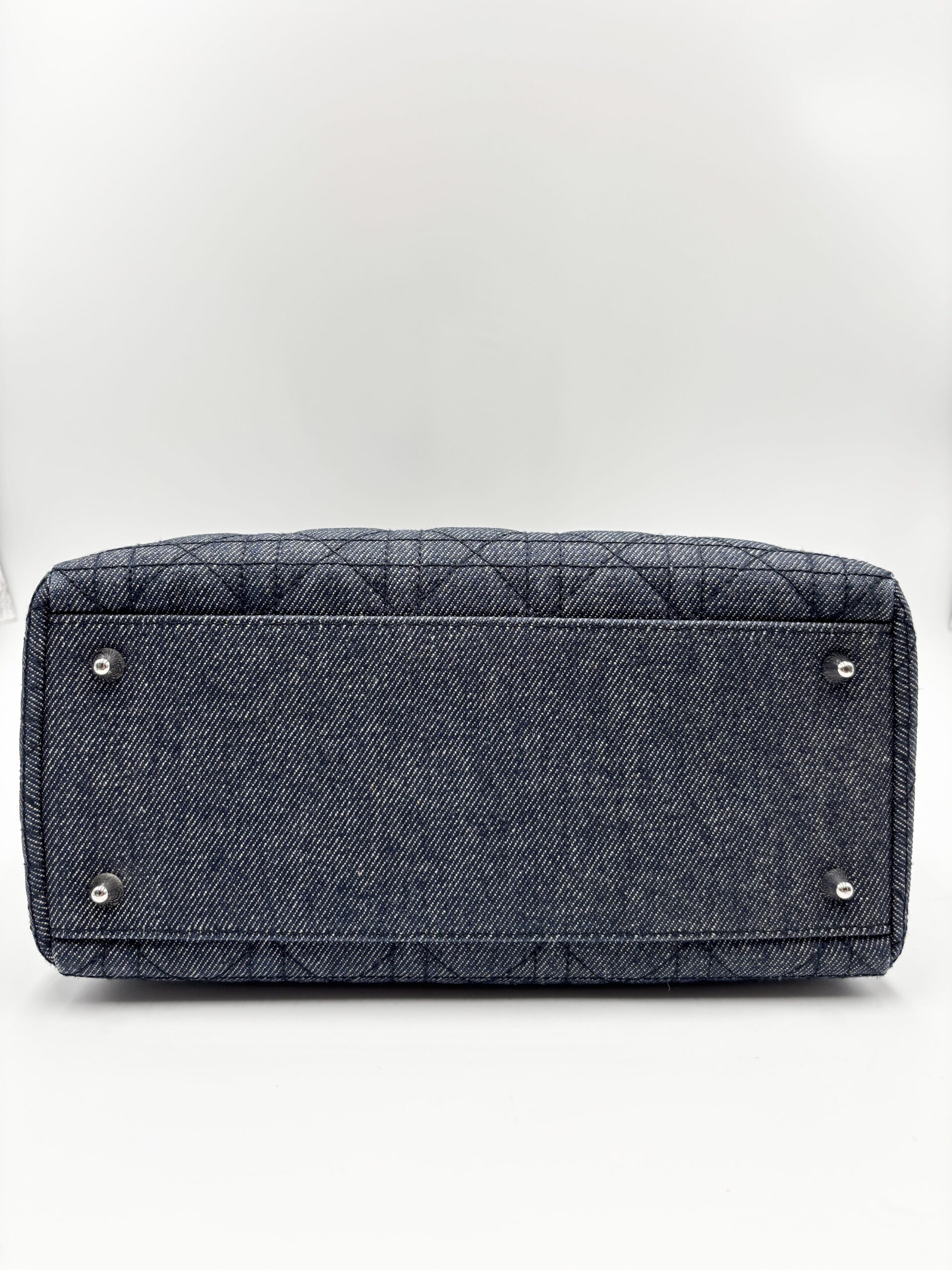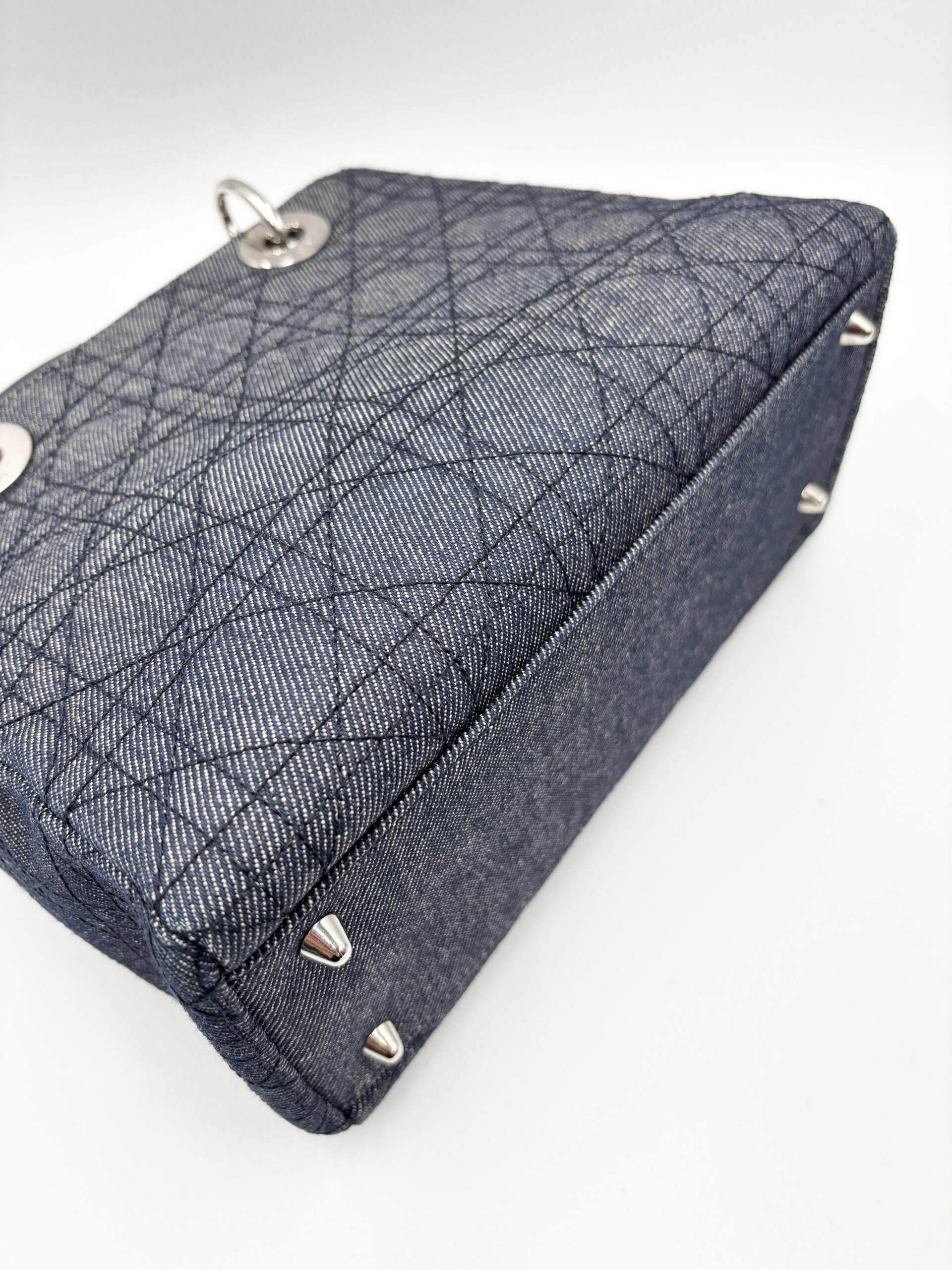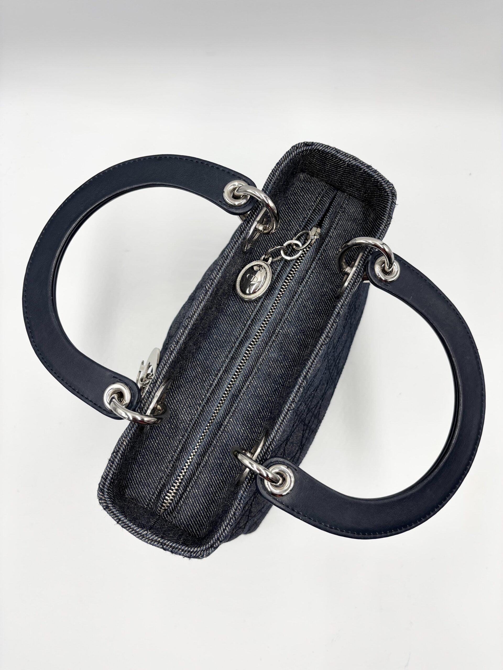 DIOR Lady medium in denim blu/grigio con finiture in pelle blu scuro.