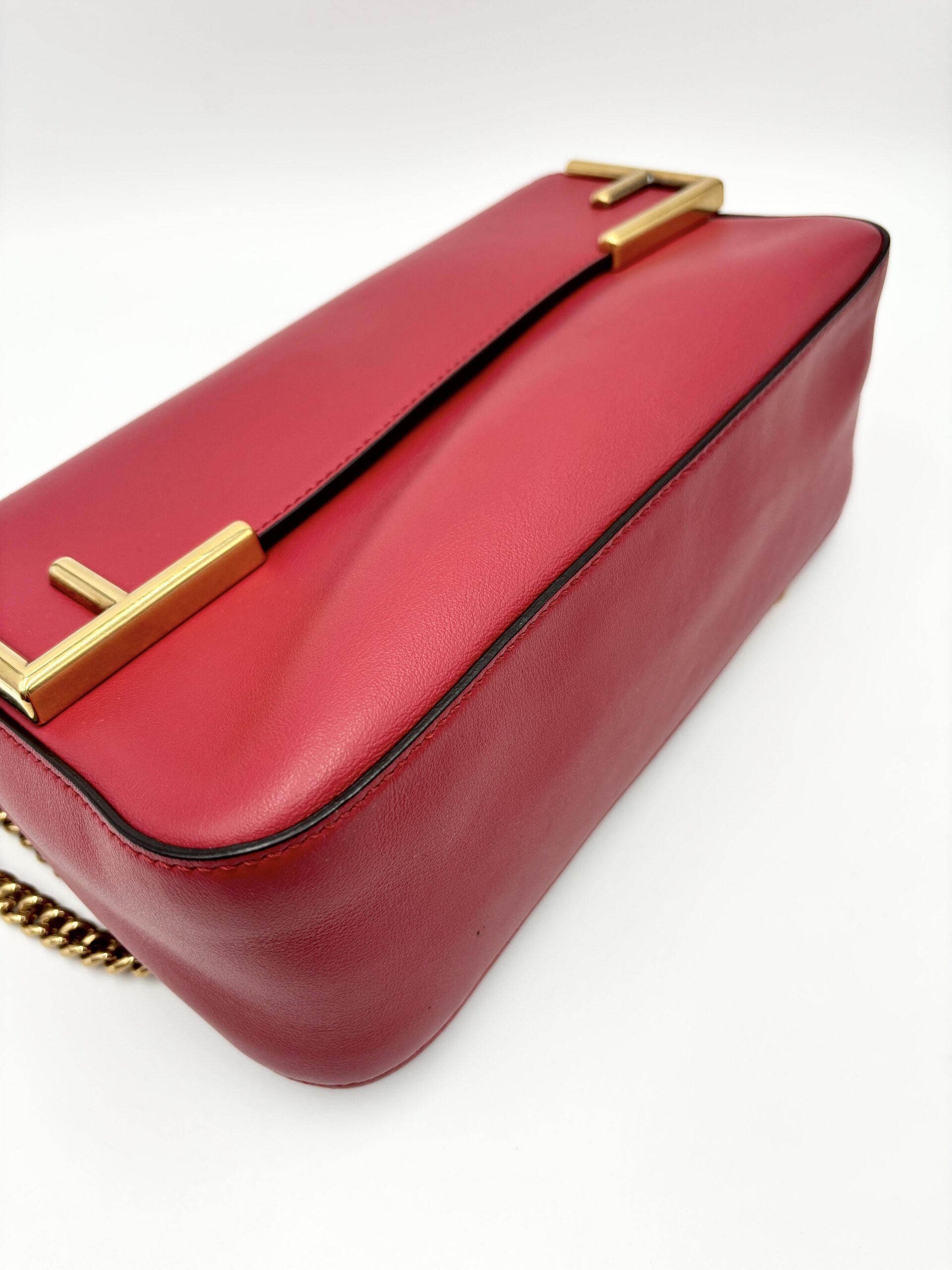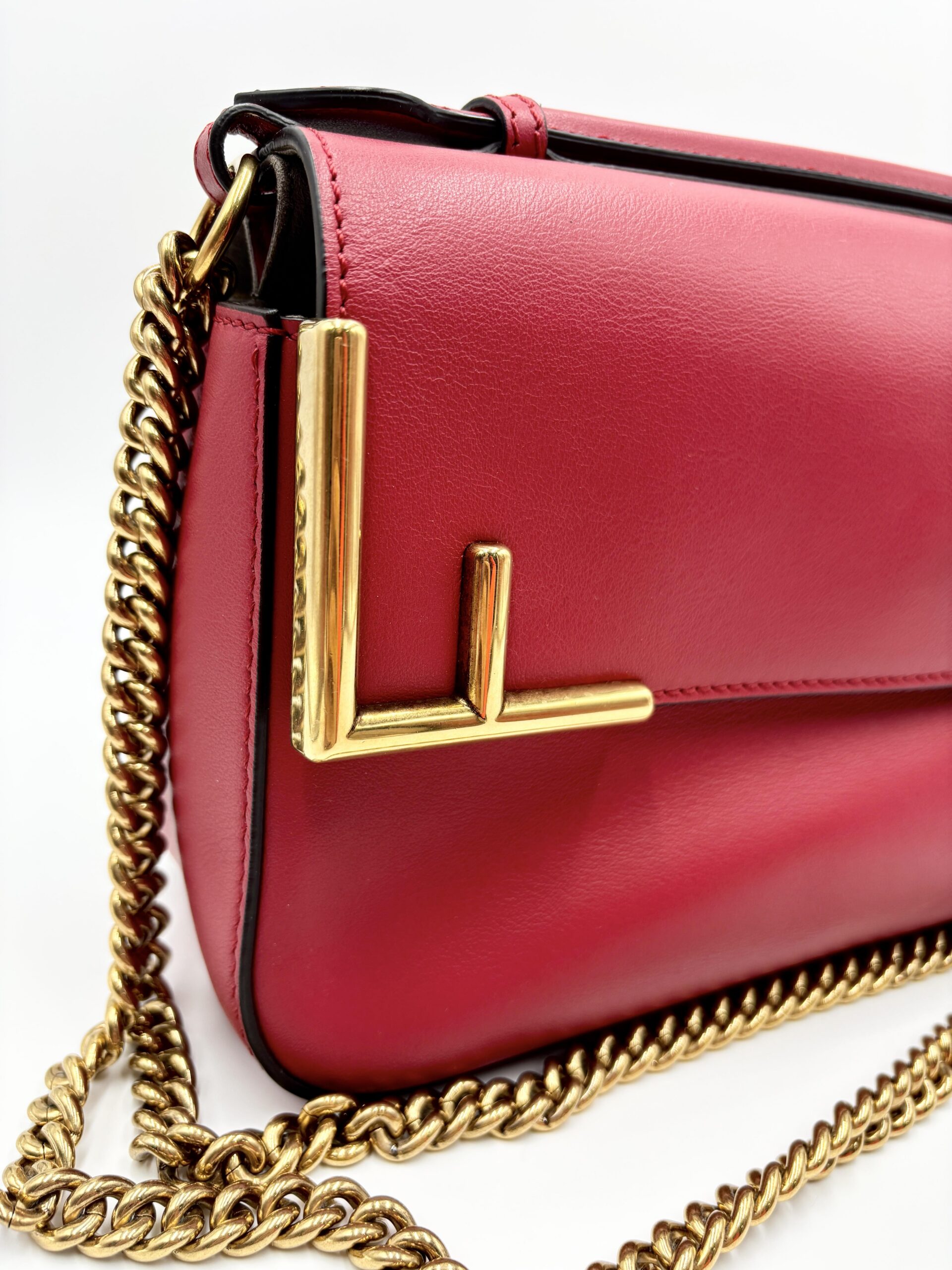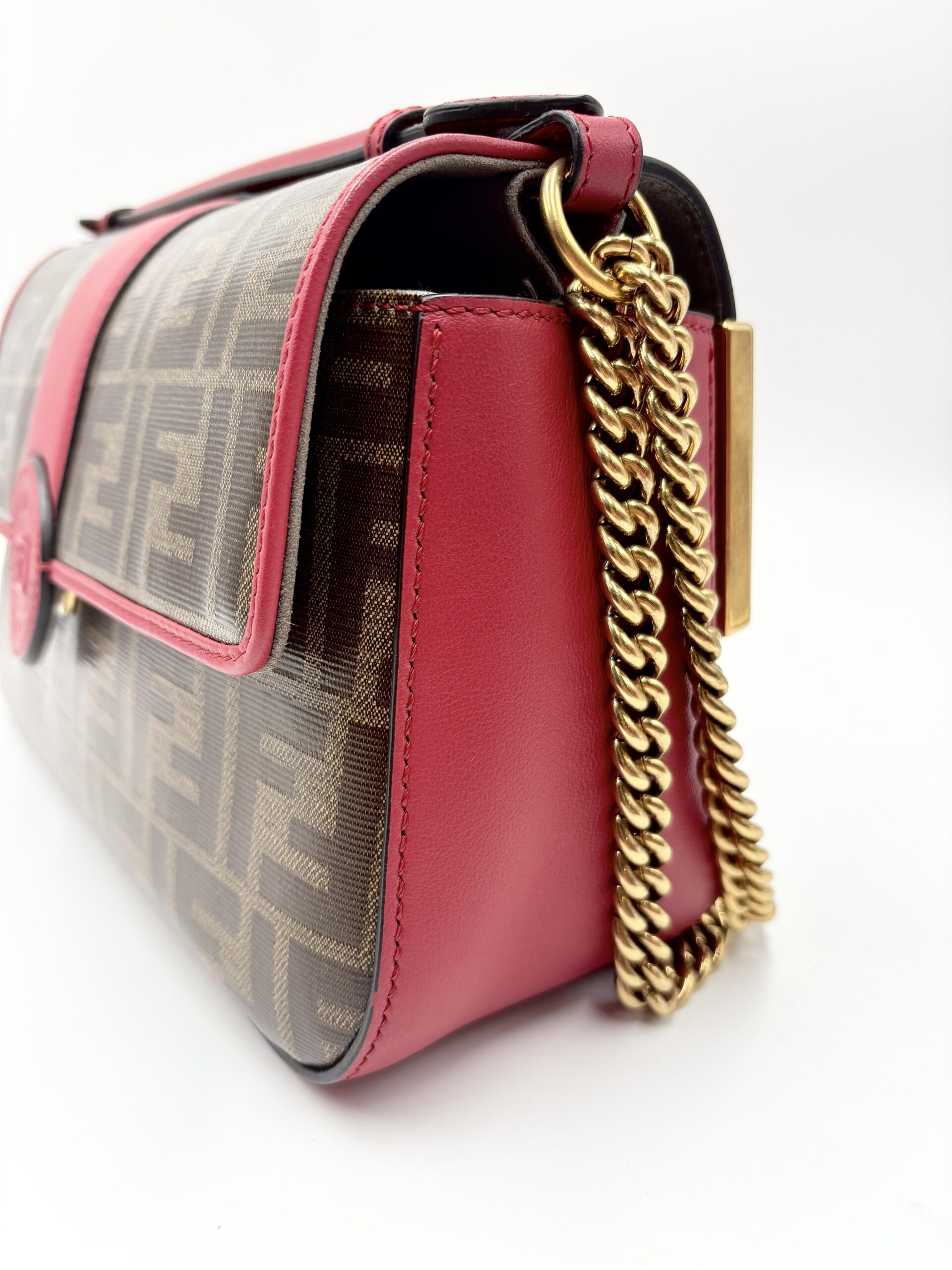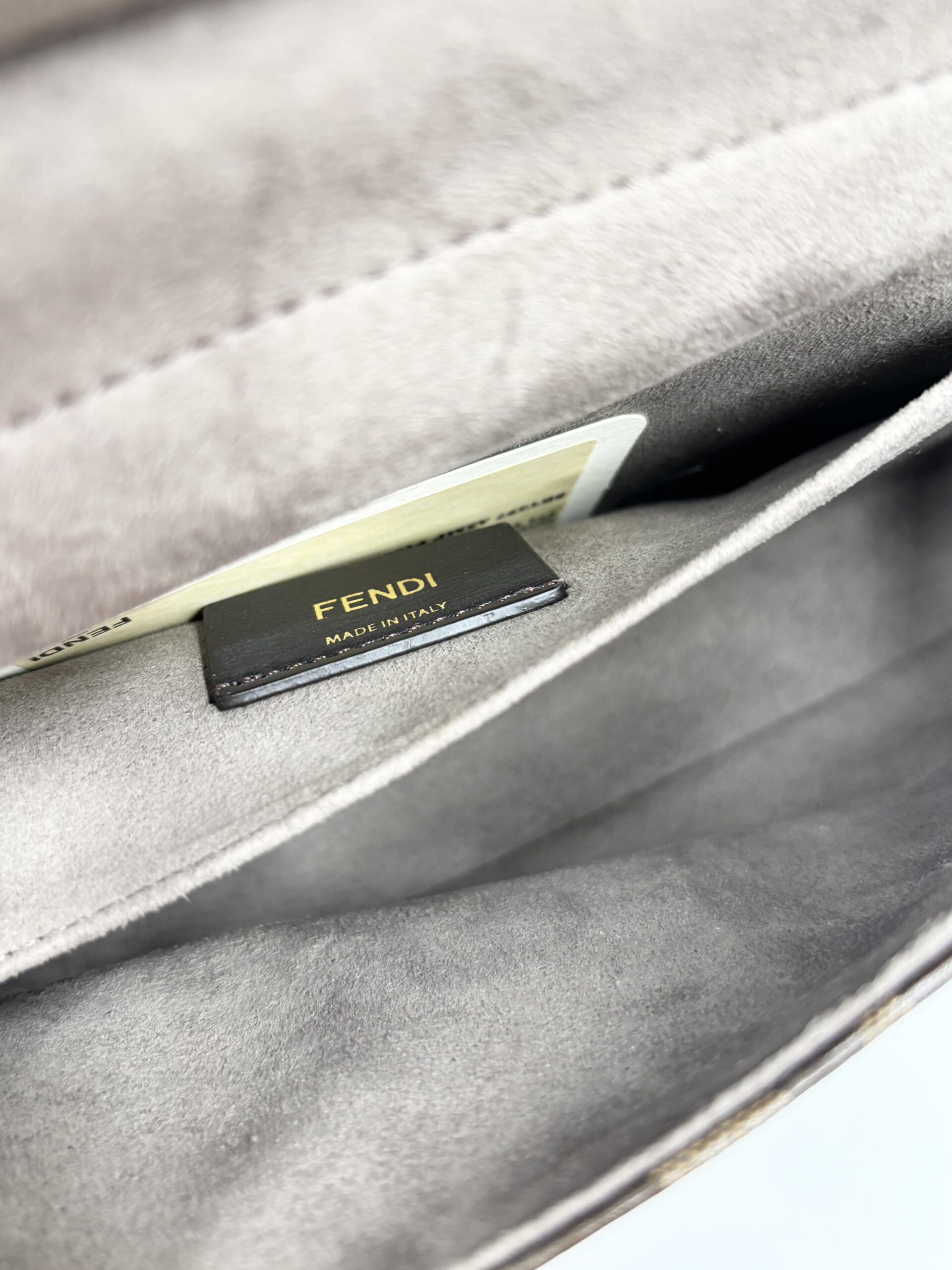 La borsa è formata da una doppia scocca, da un lato c’è la parte in pelle con la finitura angolare ad FF, dall’altra il tessuto FF supreme.