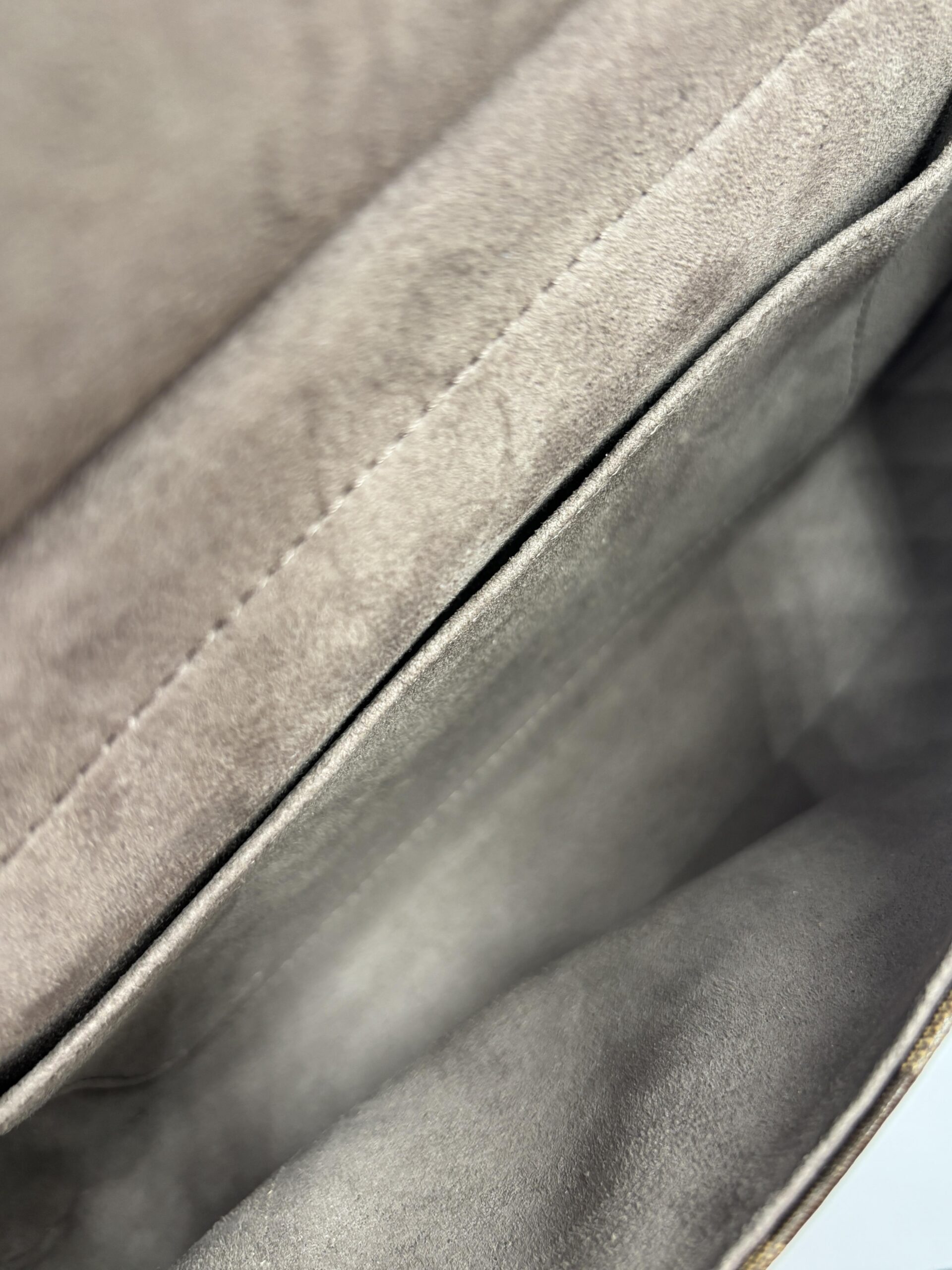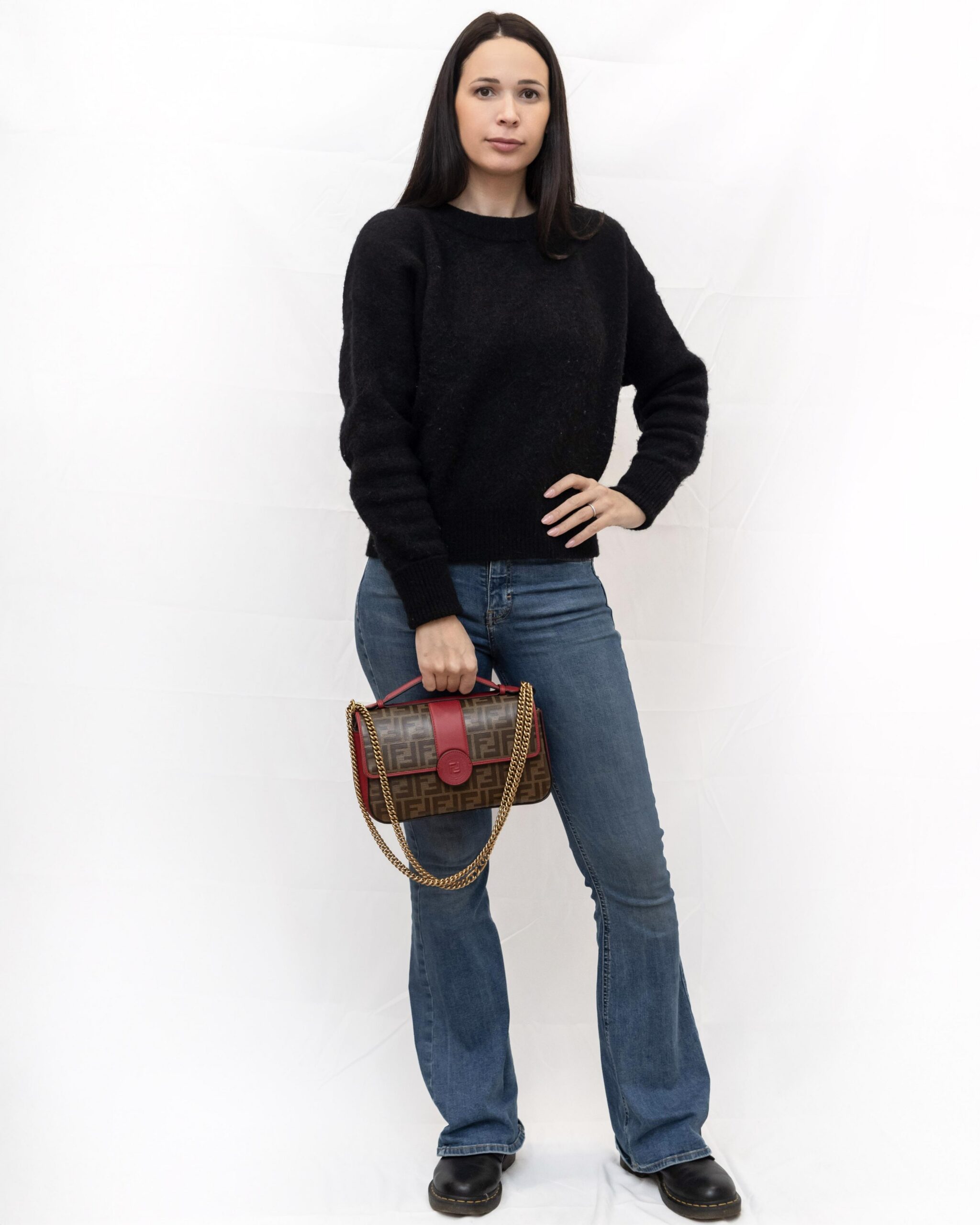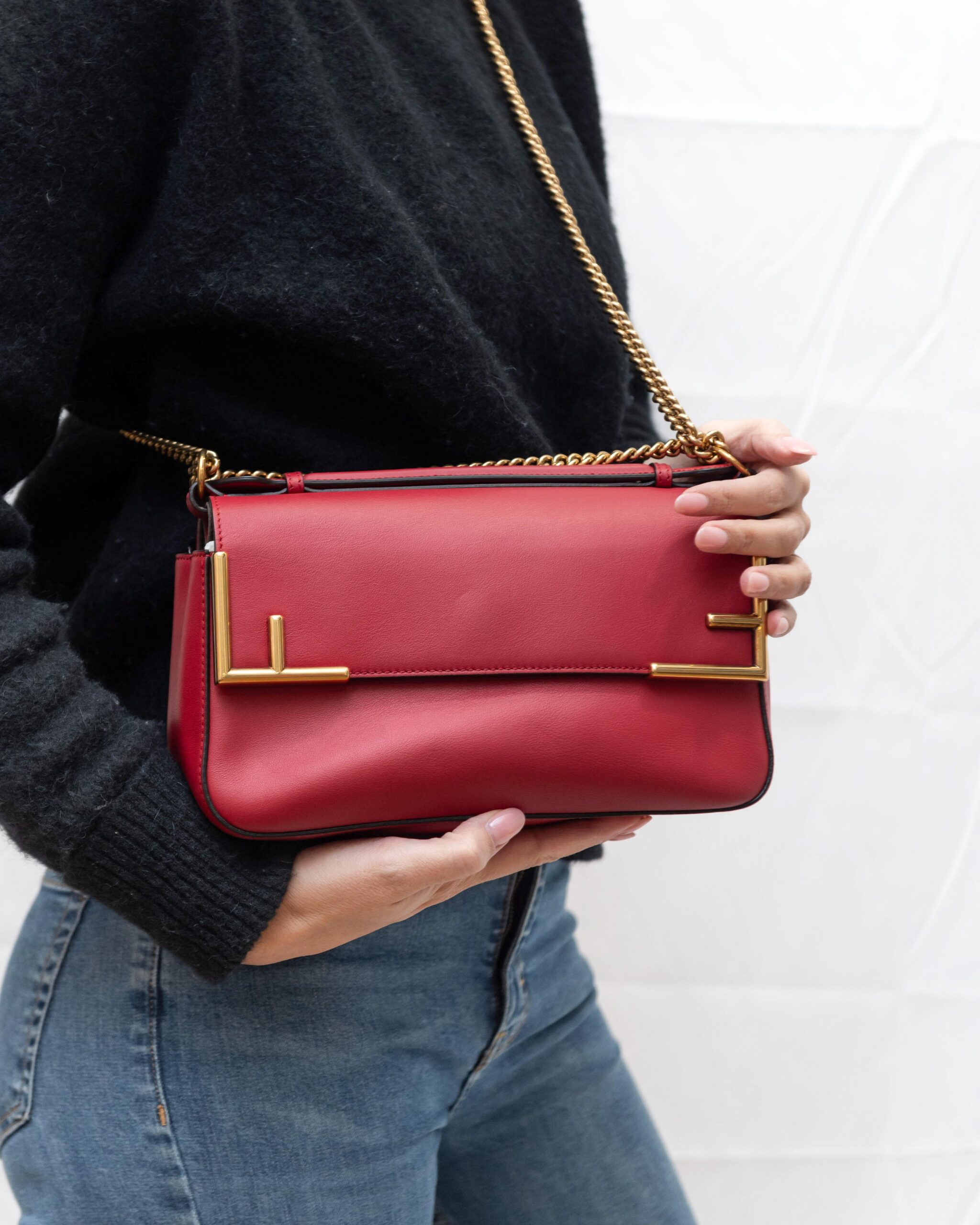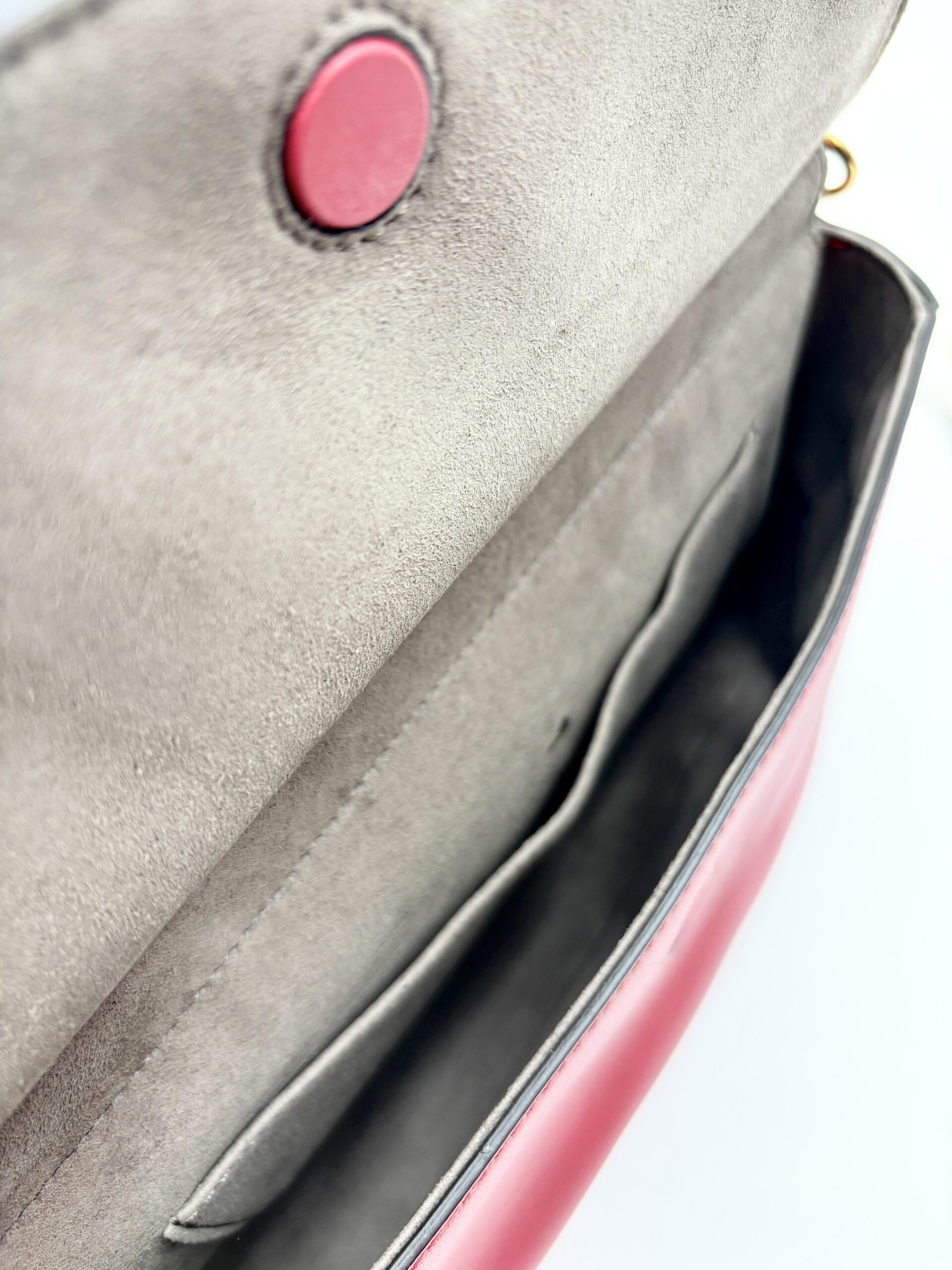 La borsa è formata da una doppia scocca, da un lato c’è la parte in pelle con la finitura angolare ad FF, dall’altra il tessuto FF supreme.