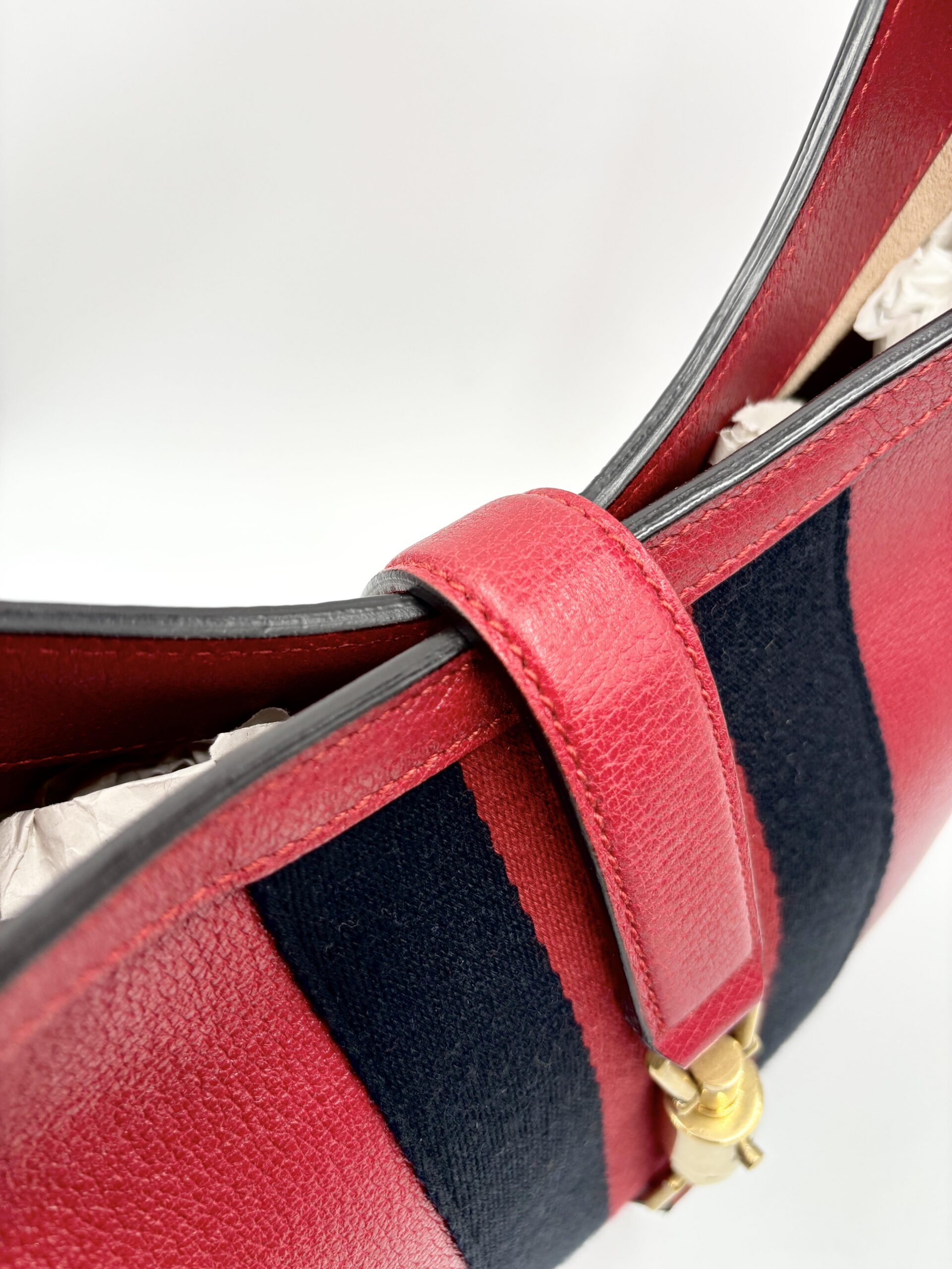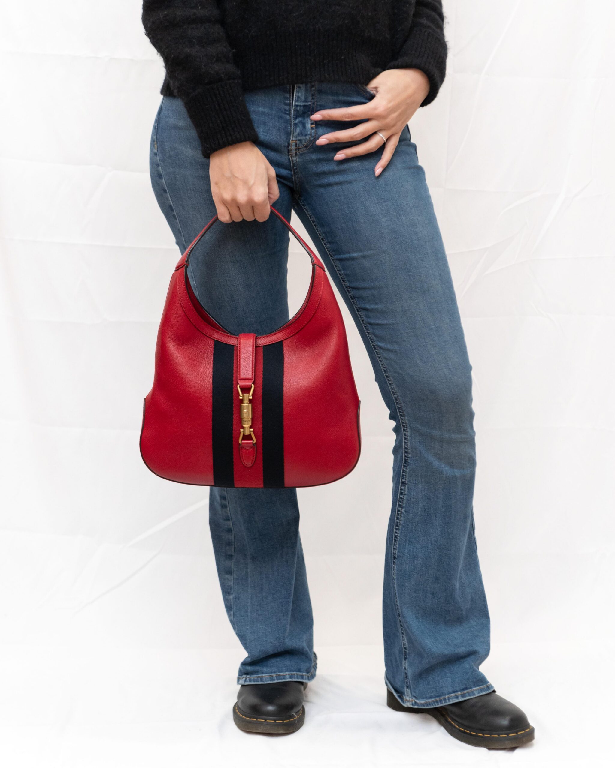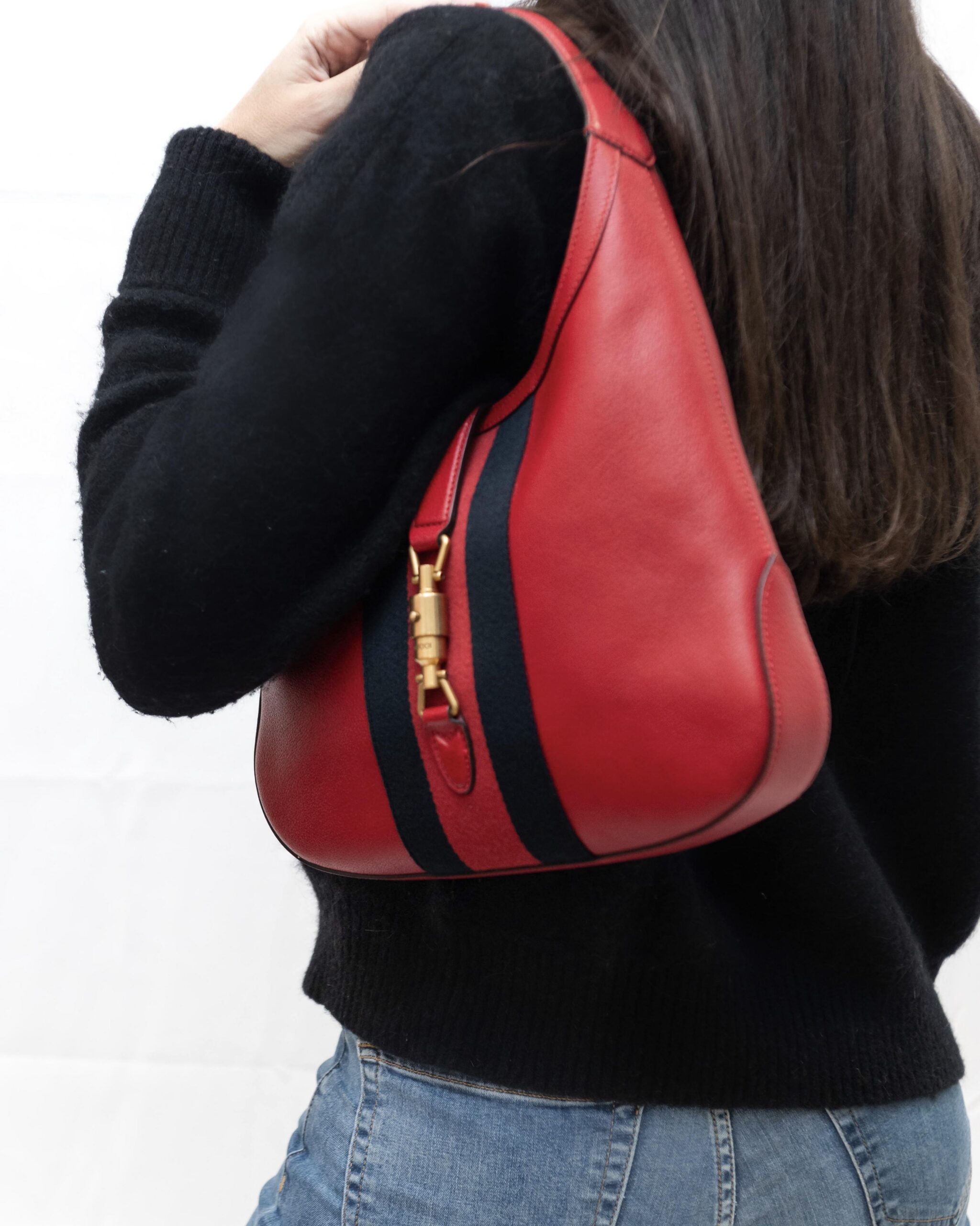GUCCI mod. Jackie in pelle rossa con fascia centrale blu/rossa/blu e pochette interna