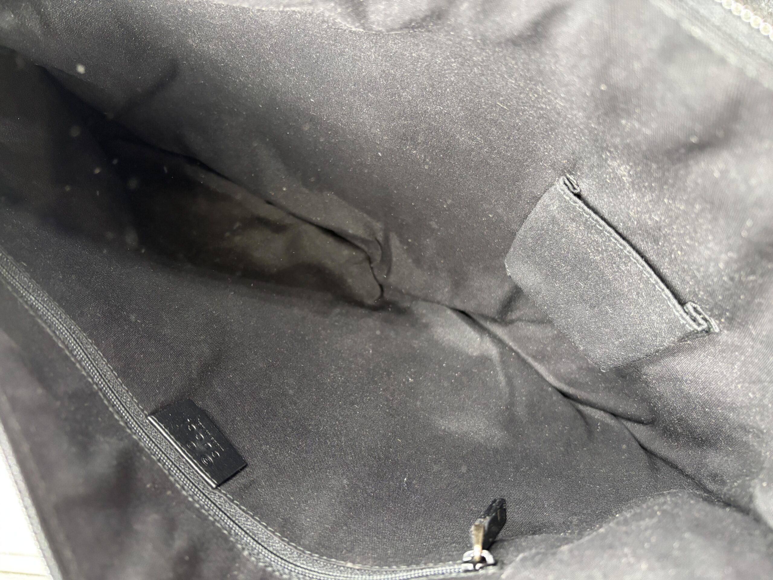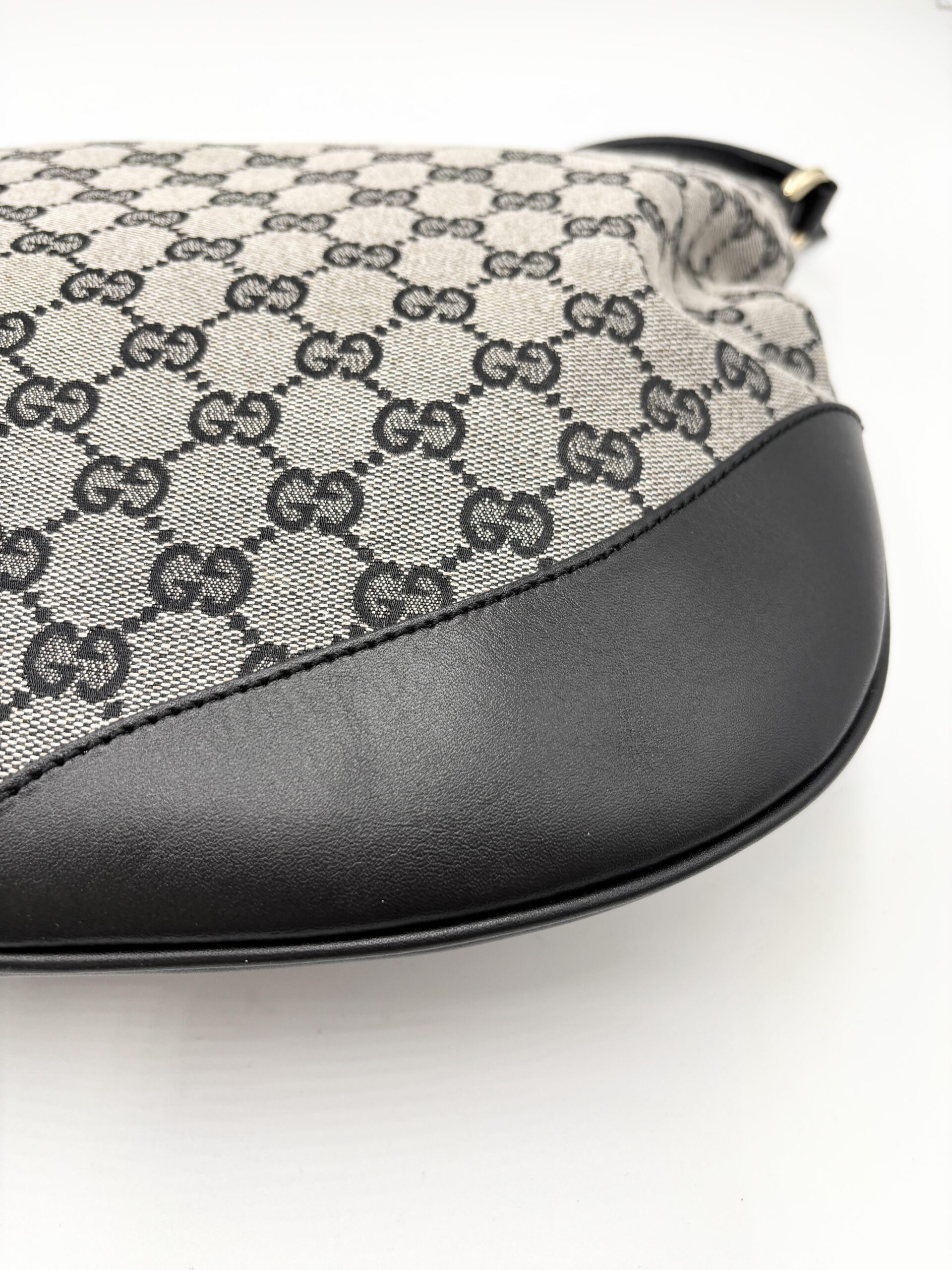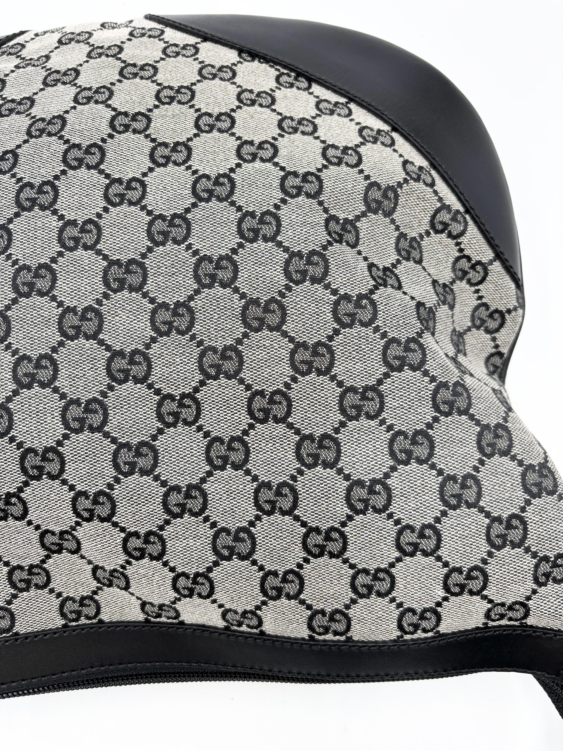 GUCCI tracolla in tessuto monogramma nero e grigio con dettagli in pelle nera