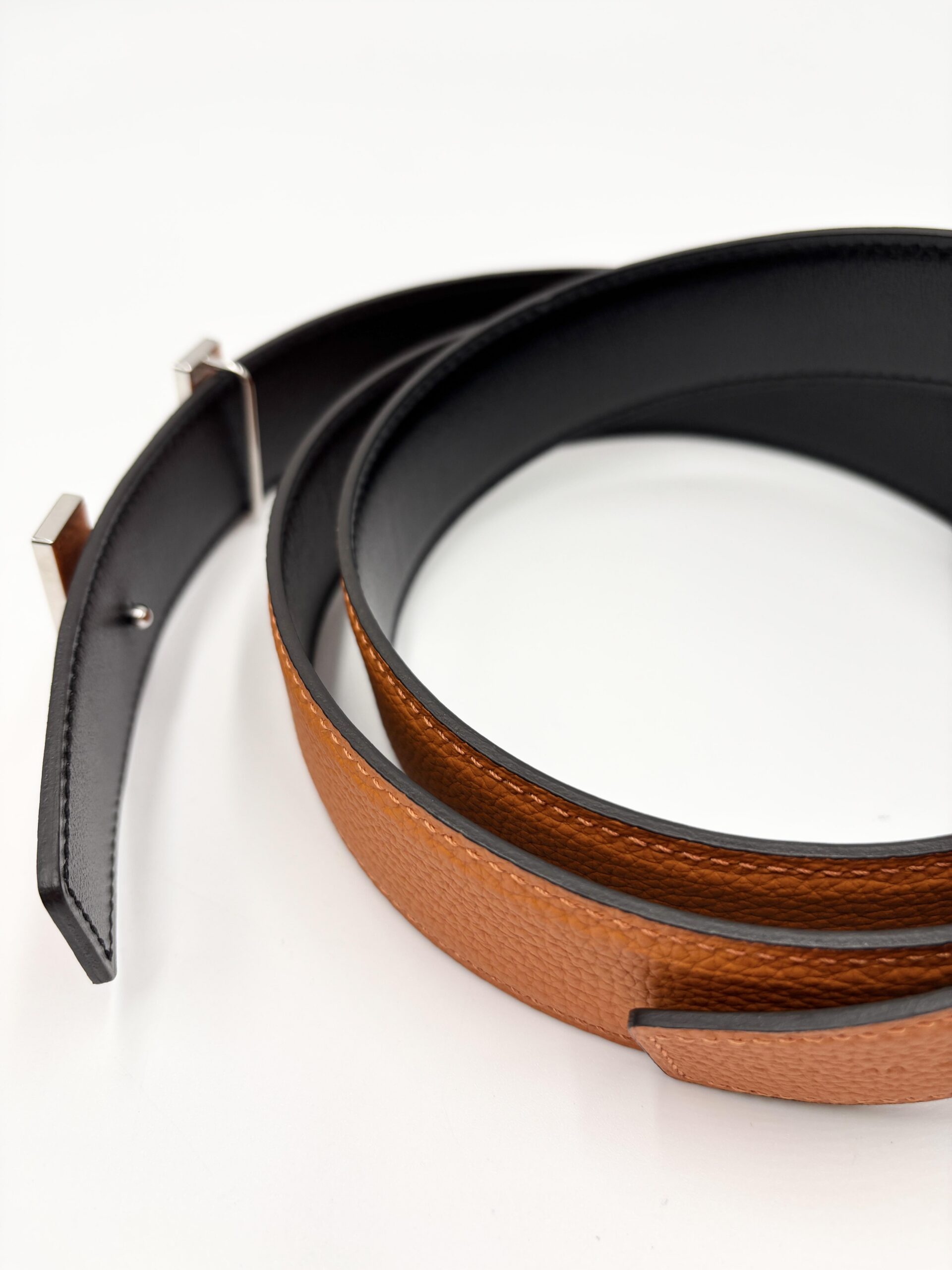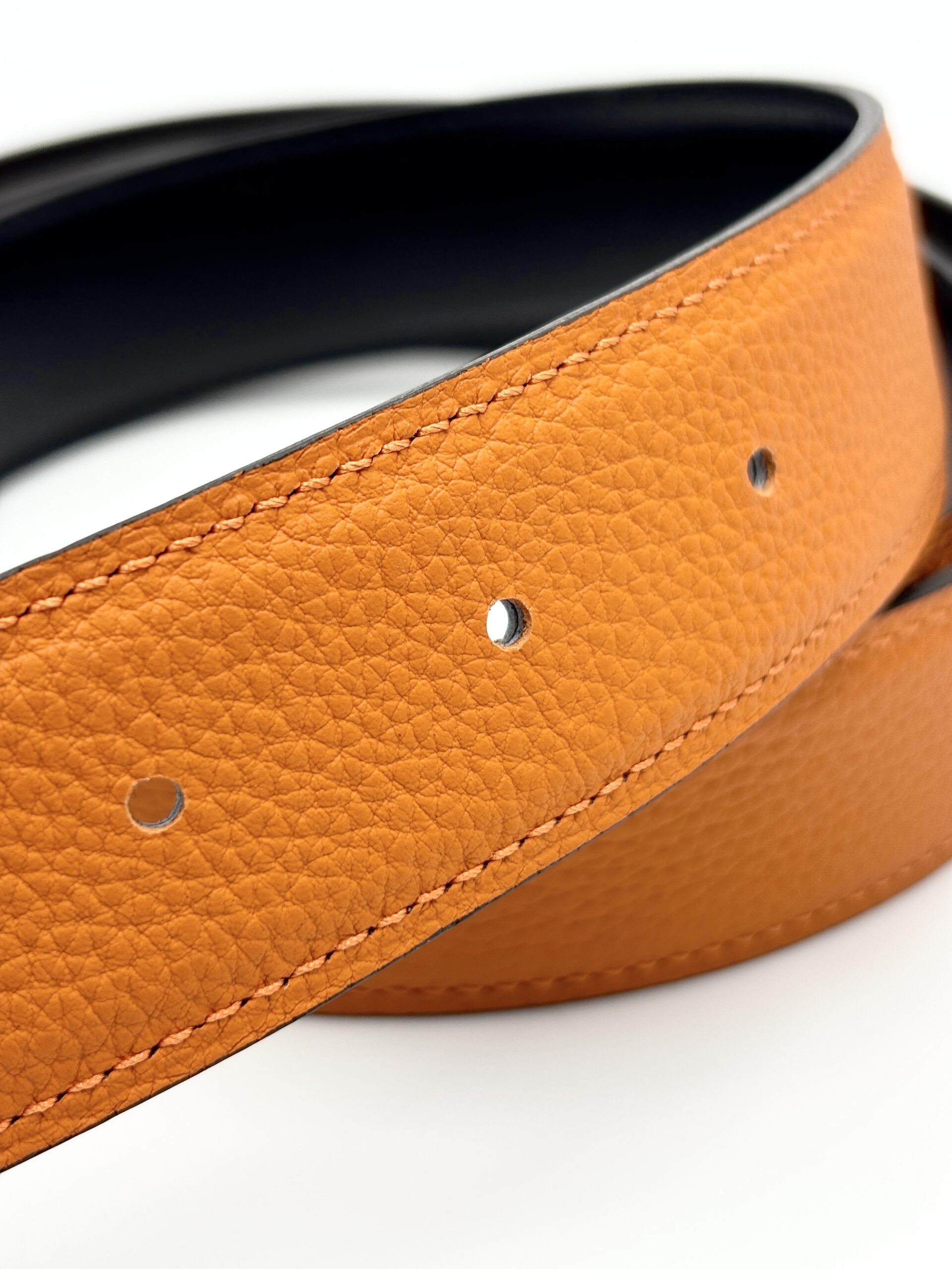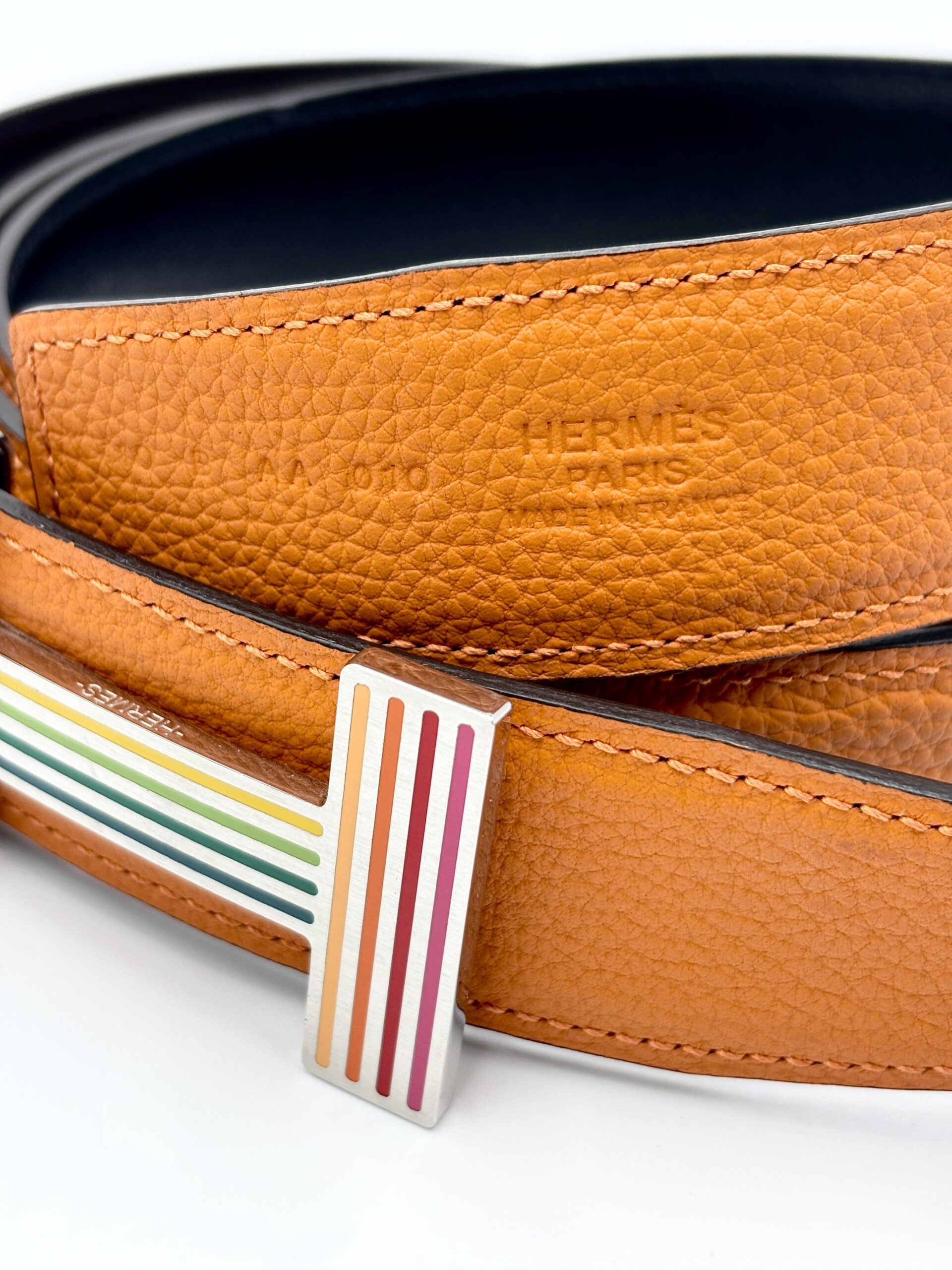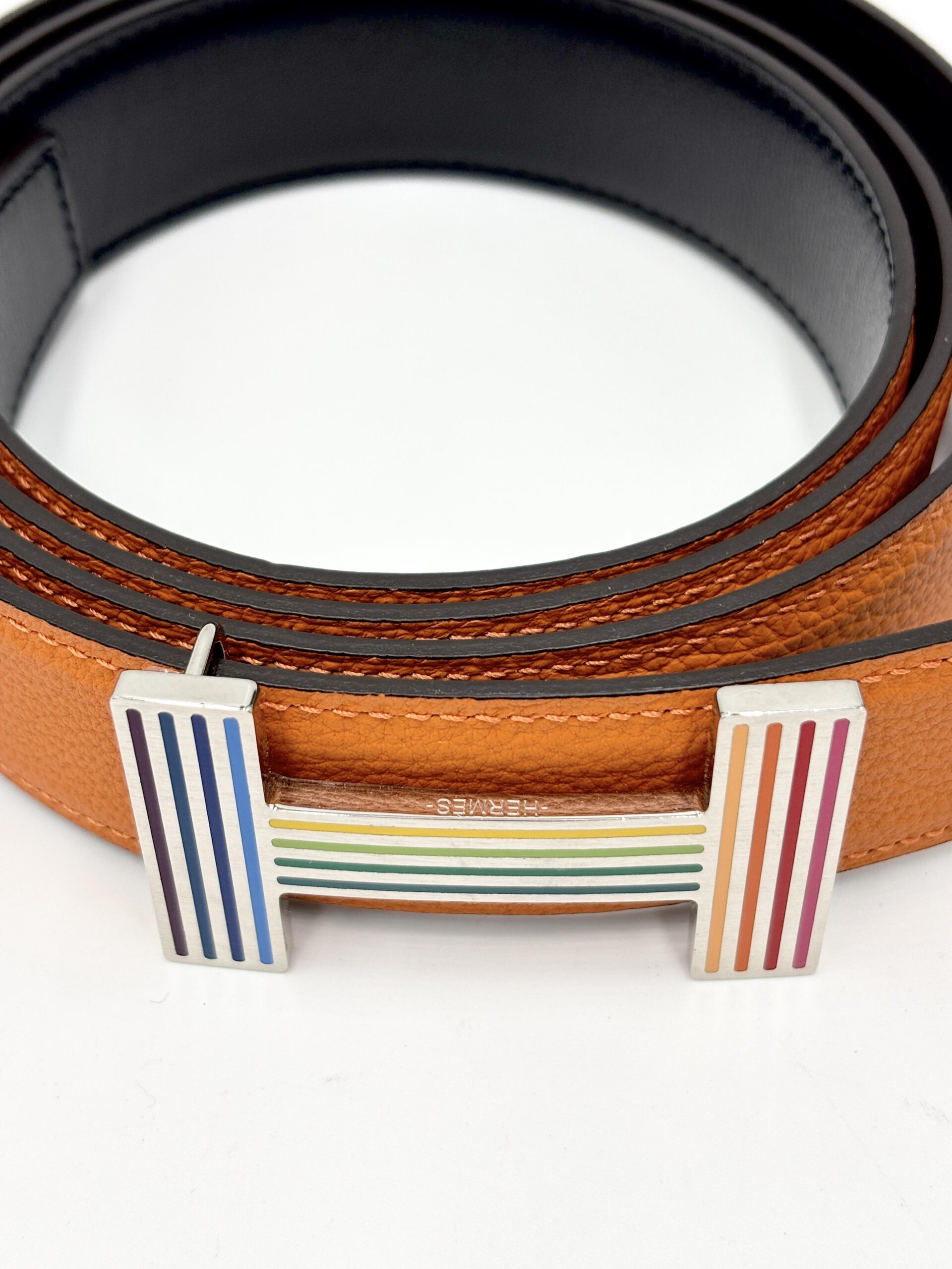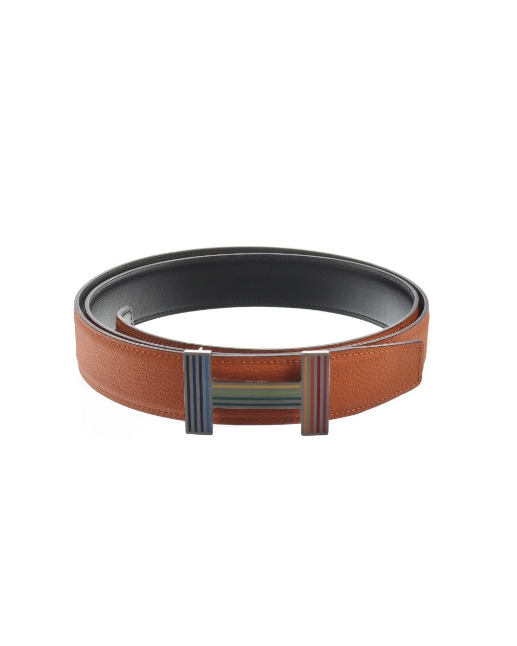 HERMES cintura Constance con fibbia Rainbow in pelle reversibile nero (vitello box) e arancio (togo leather)