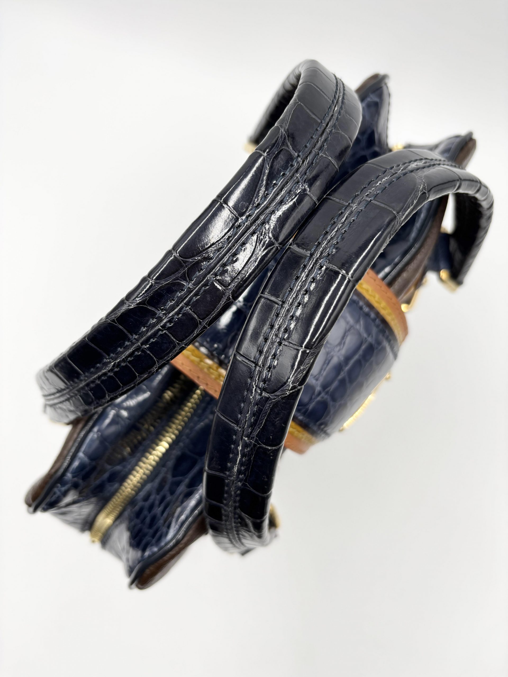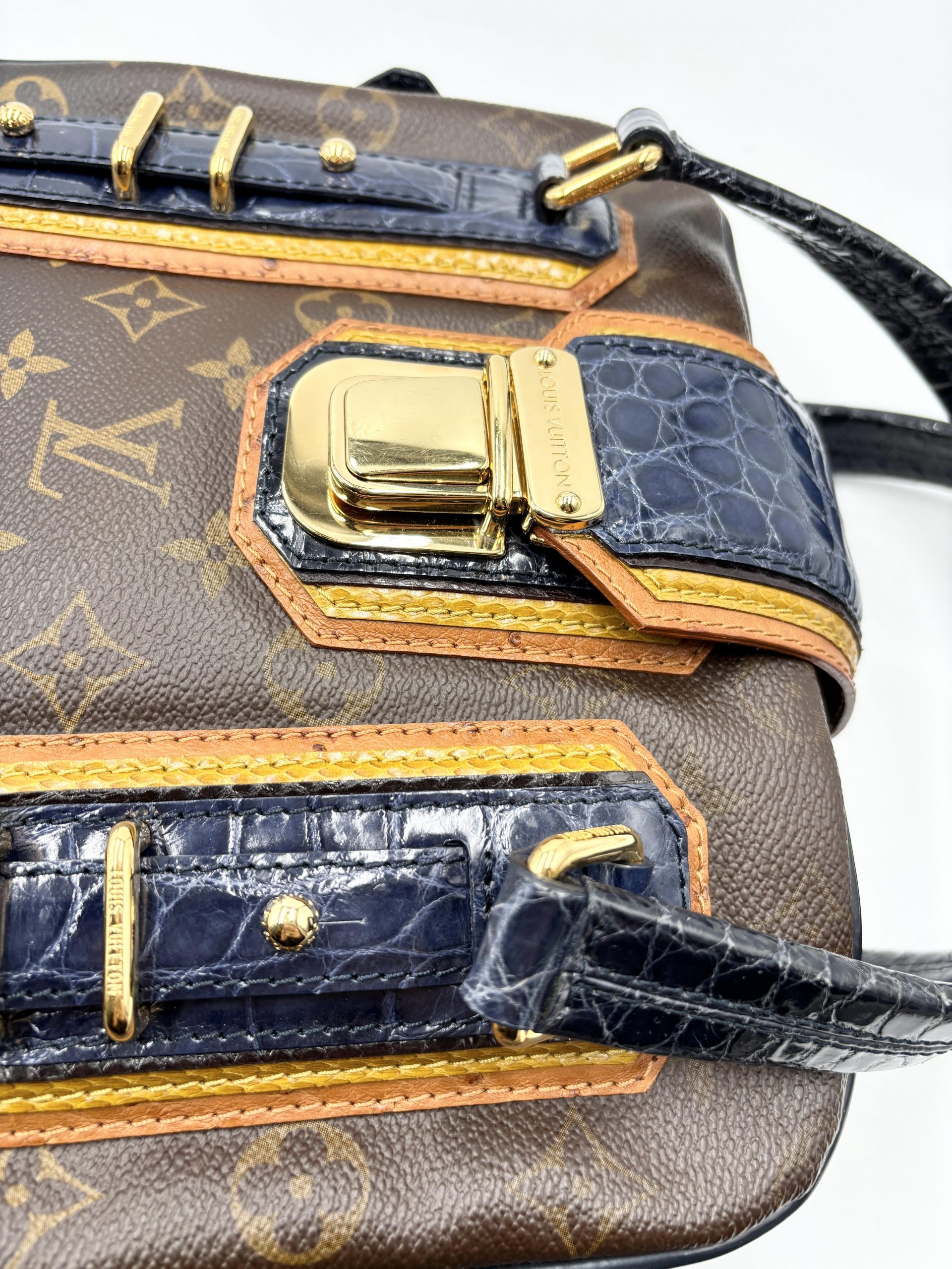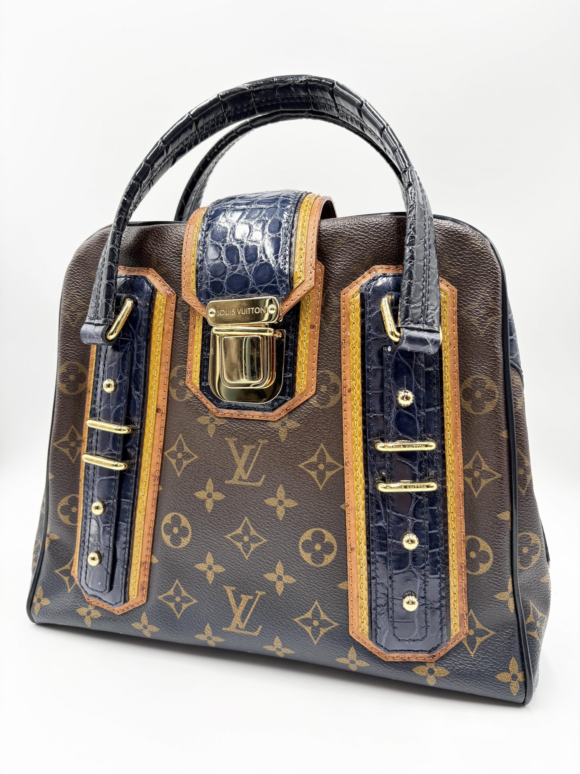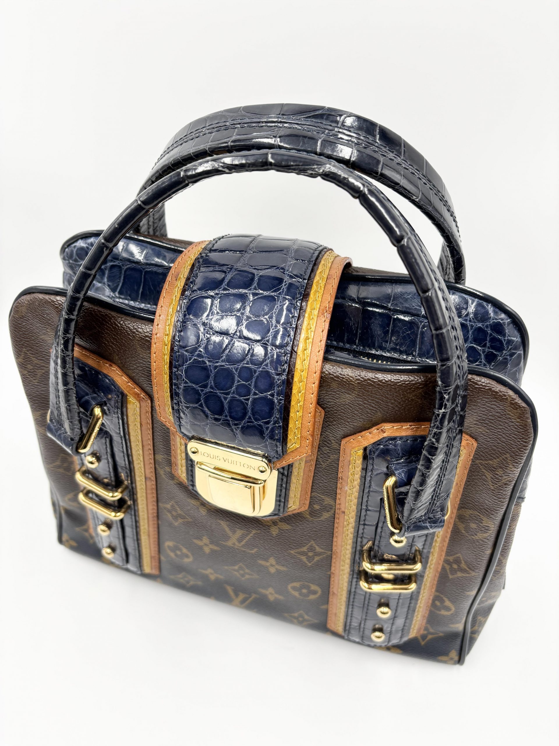 Questa particolare e rarissima Limite Edition è costituita da tessuto monogram con sfumatura blu alla base della borsa, manici e profili in pelle di coccodrillo blu, di serpente e di struzzo.