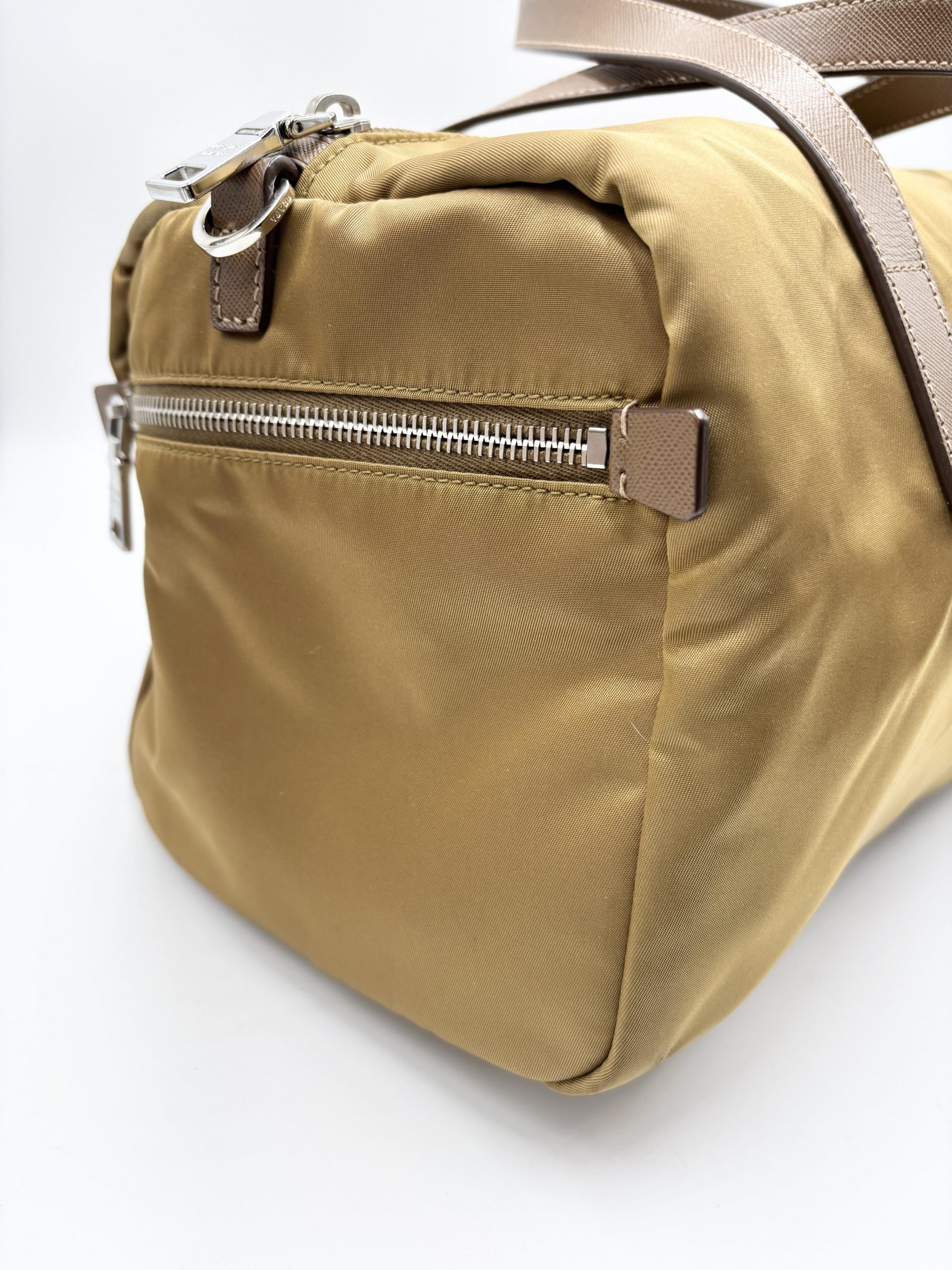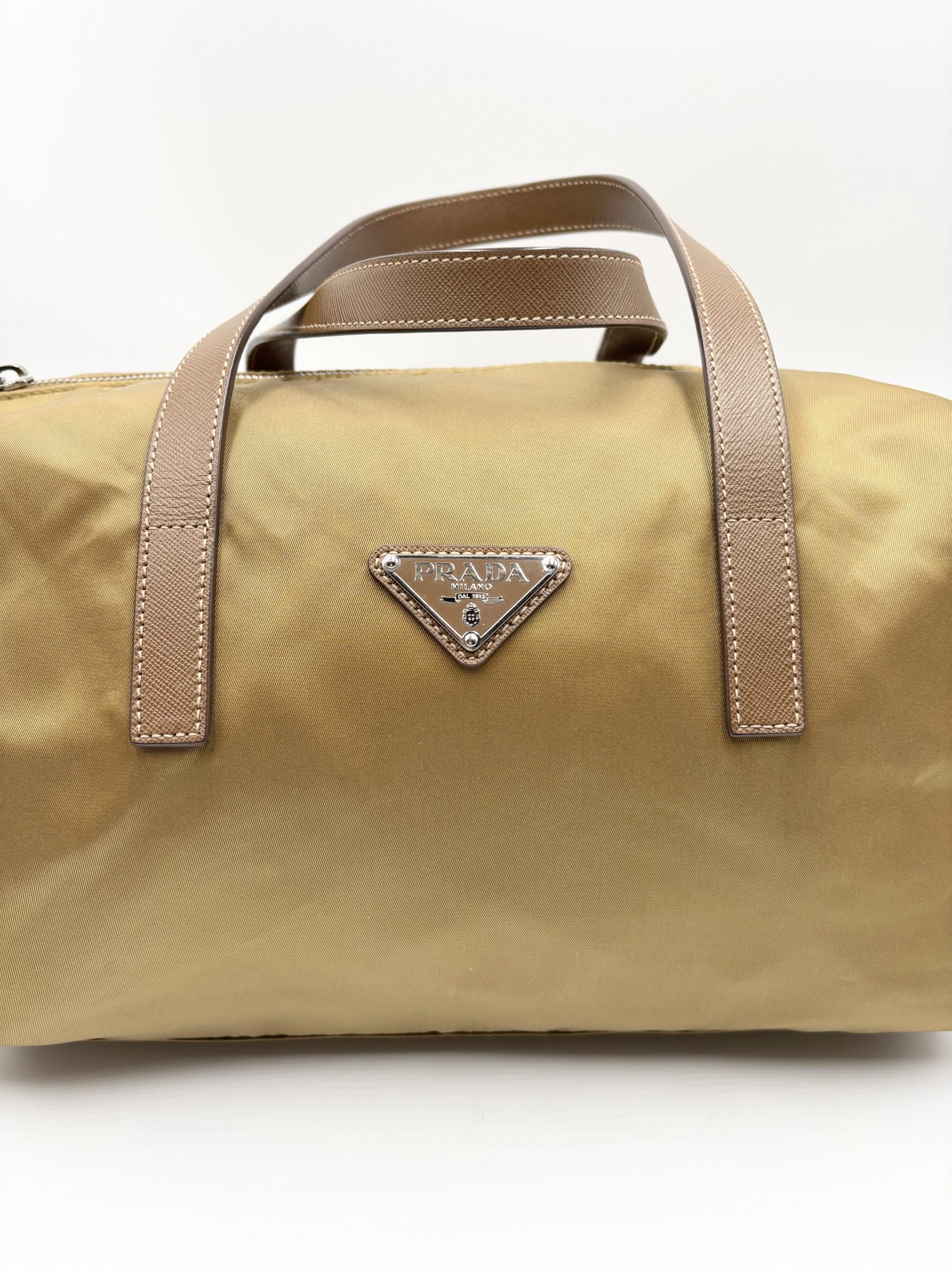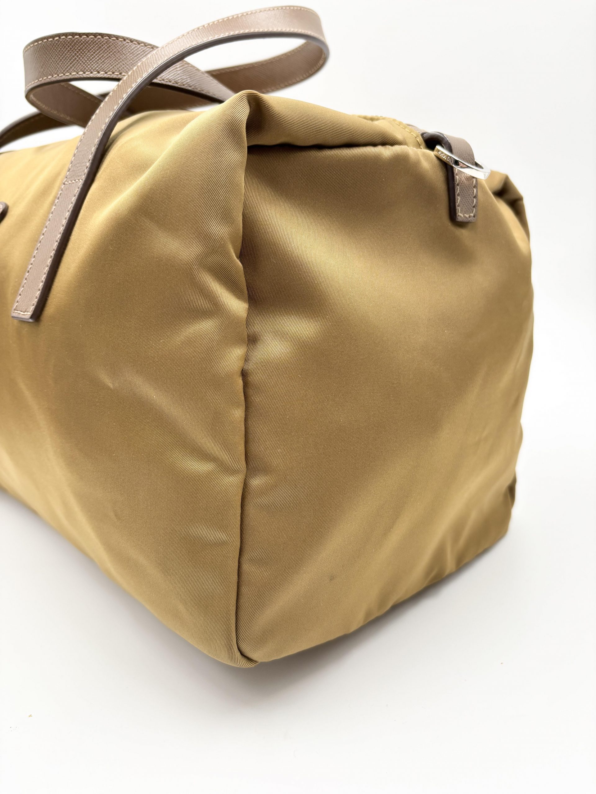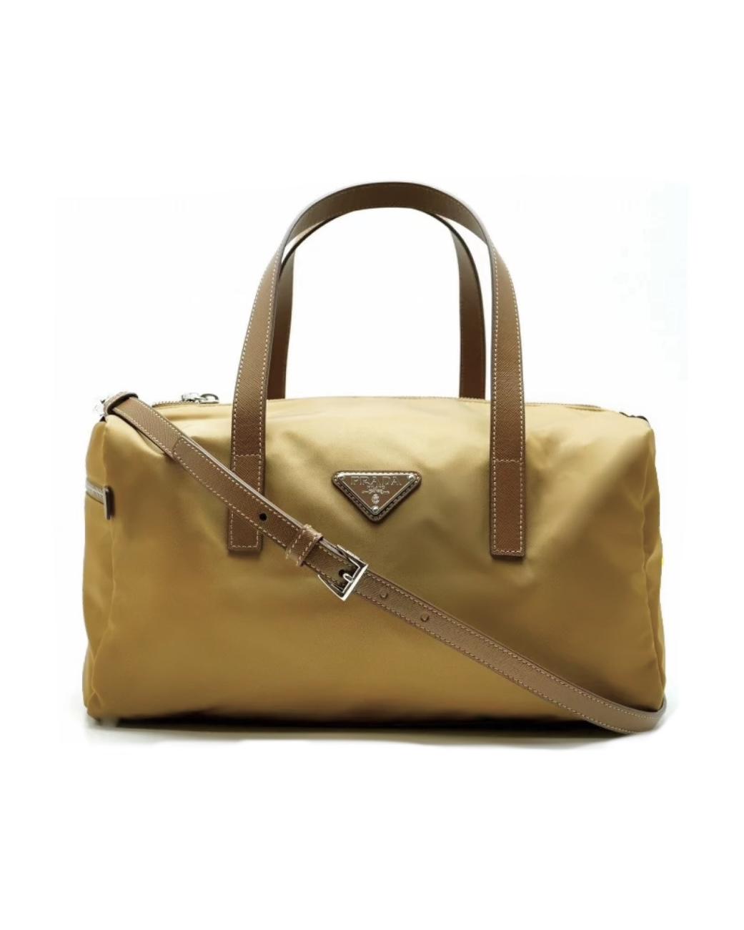 PRADA bauletto in tela vela color caramello con dettagli dei manici e tracolla in pelle saffiano