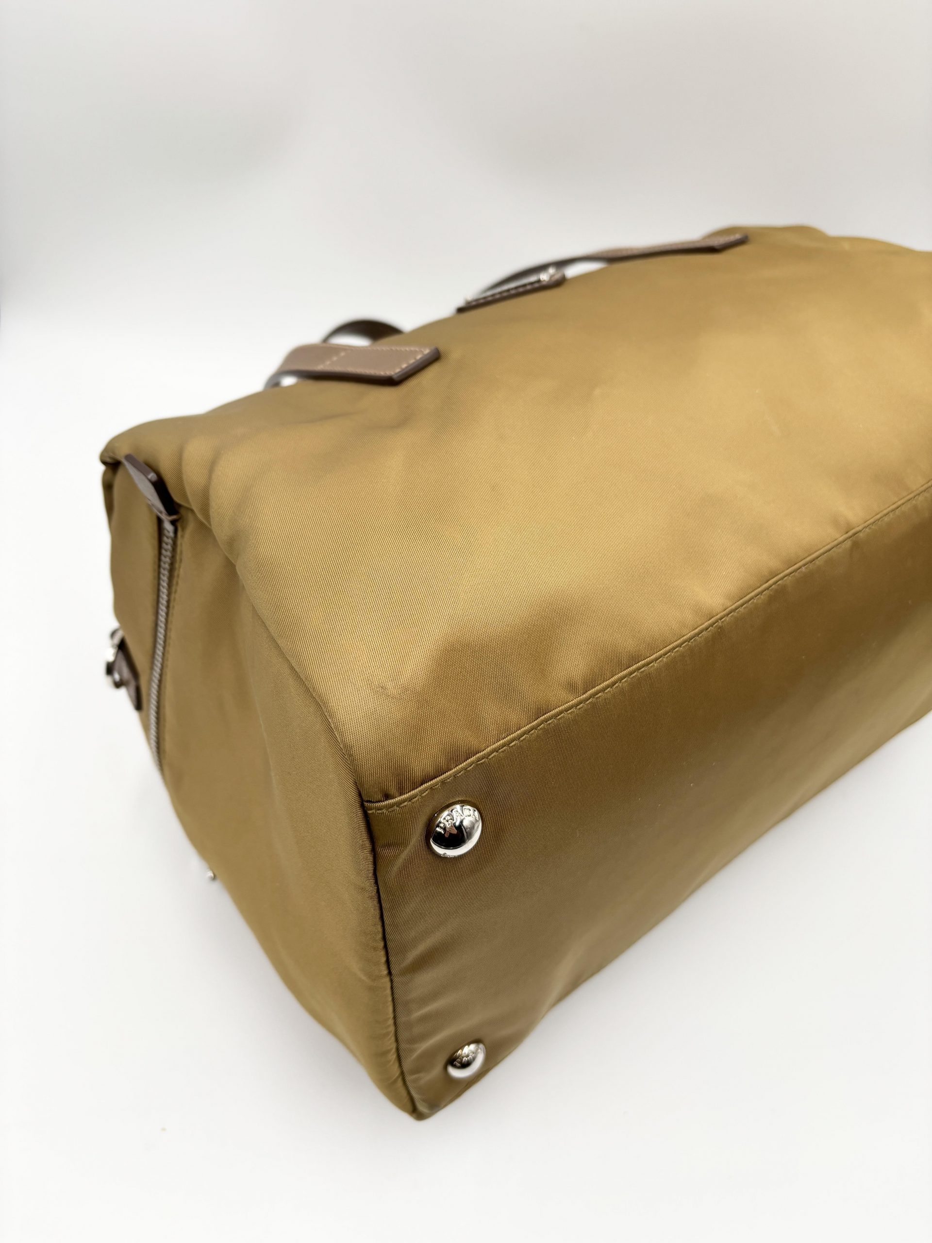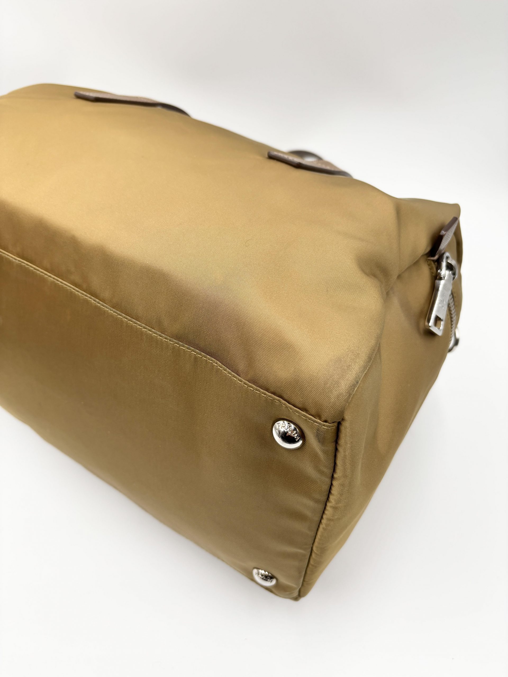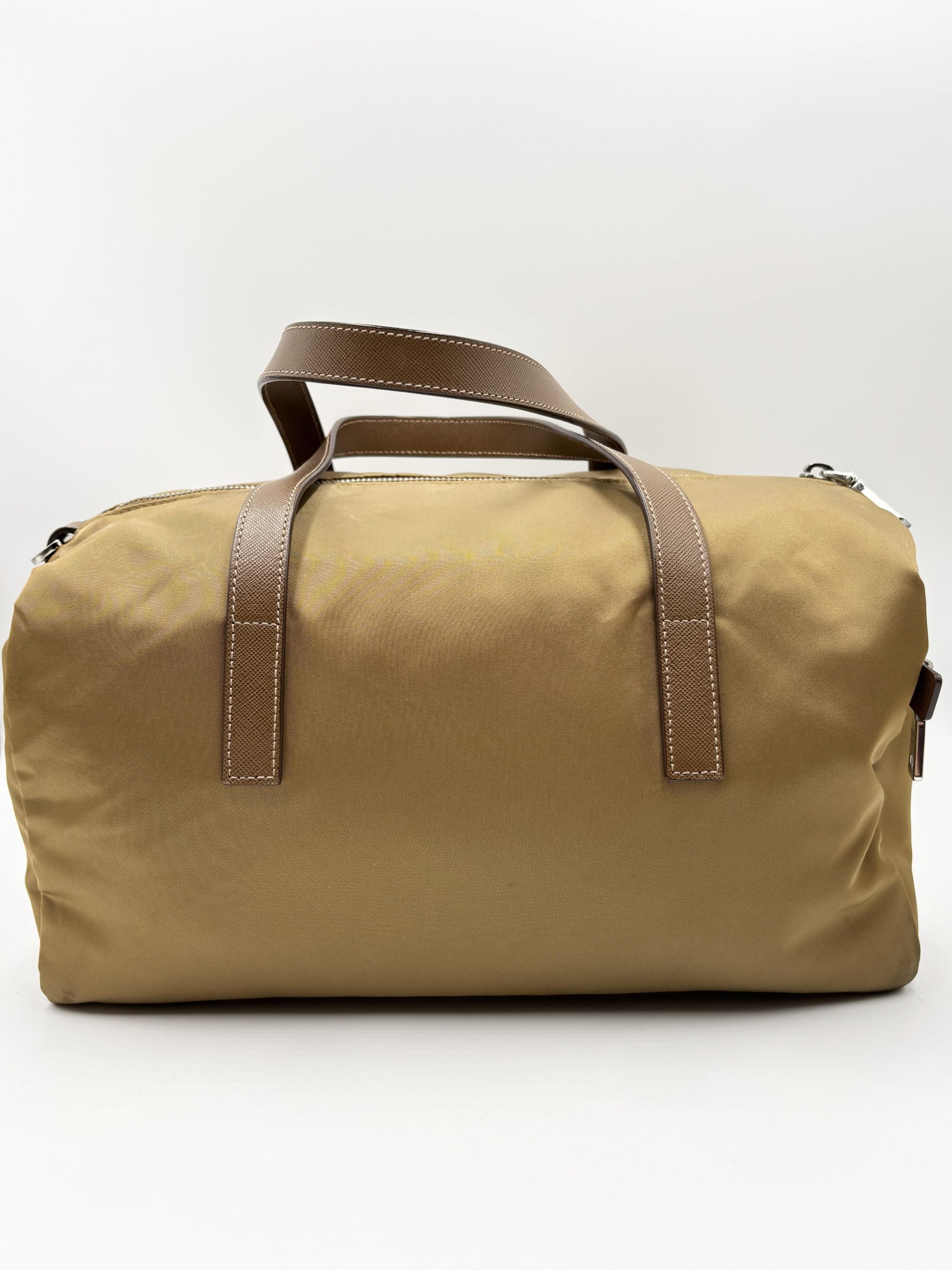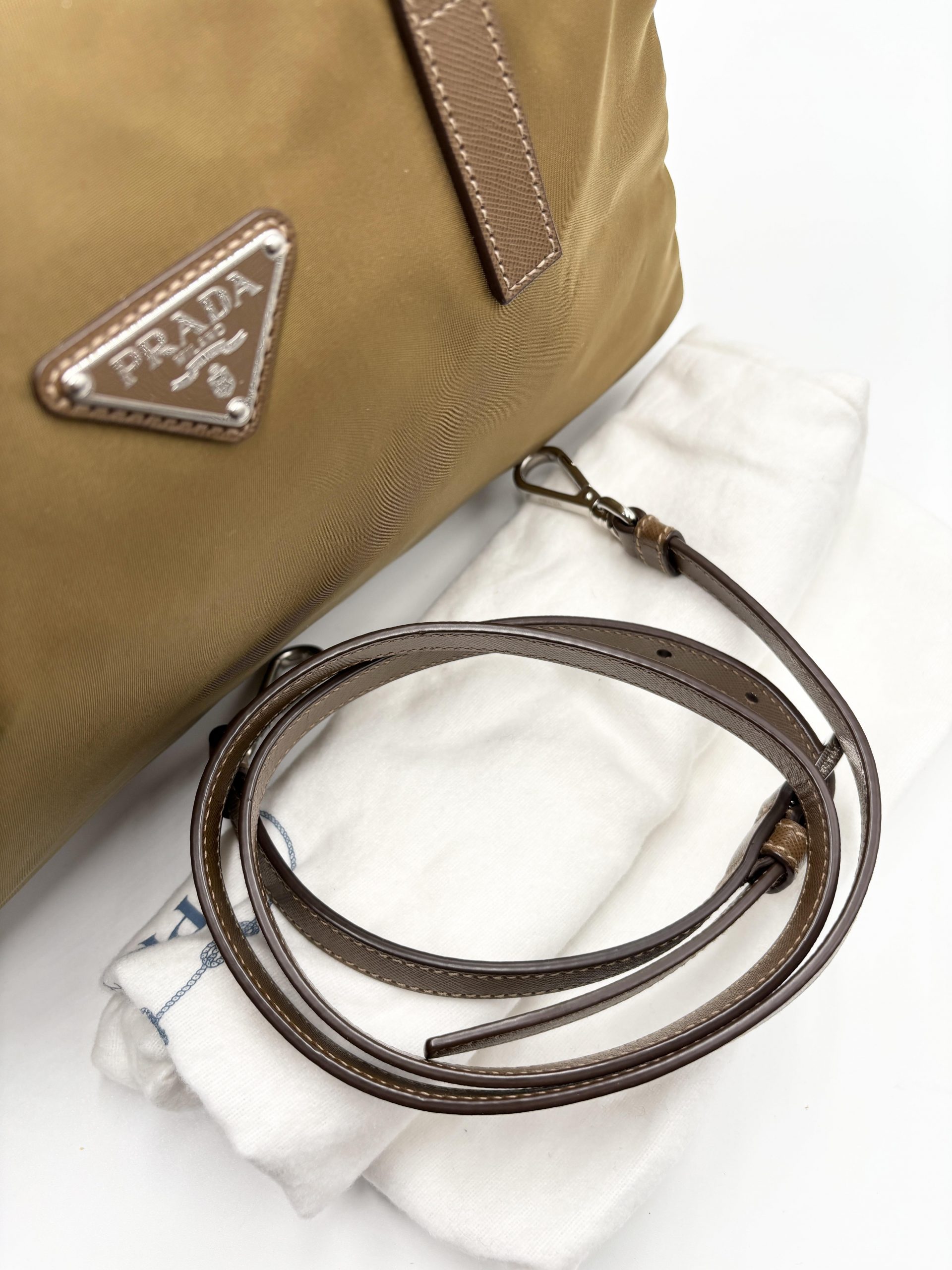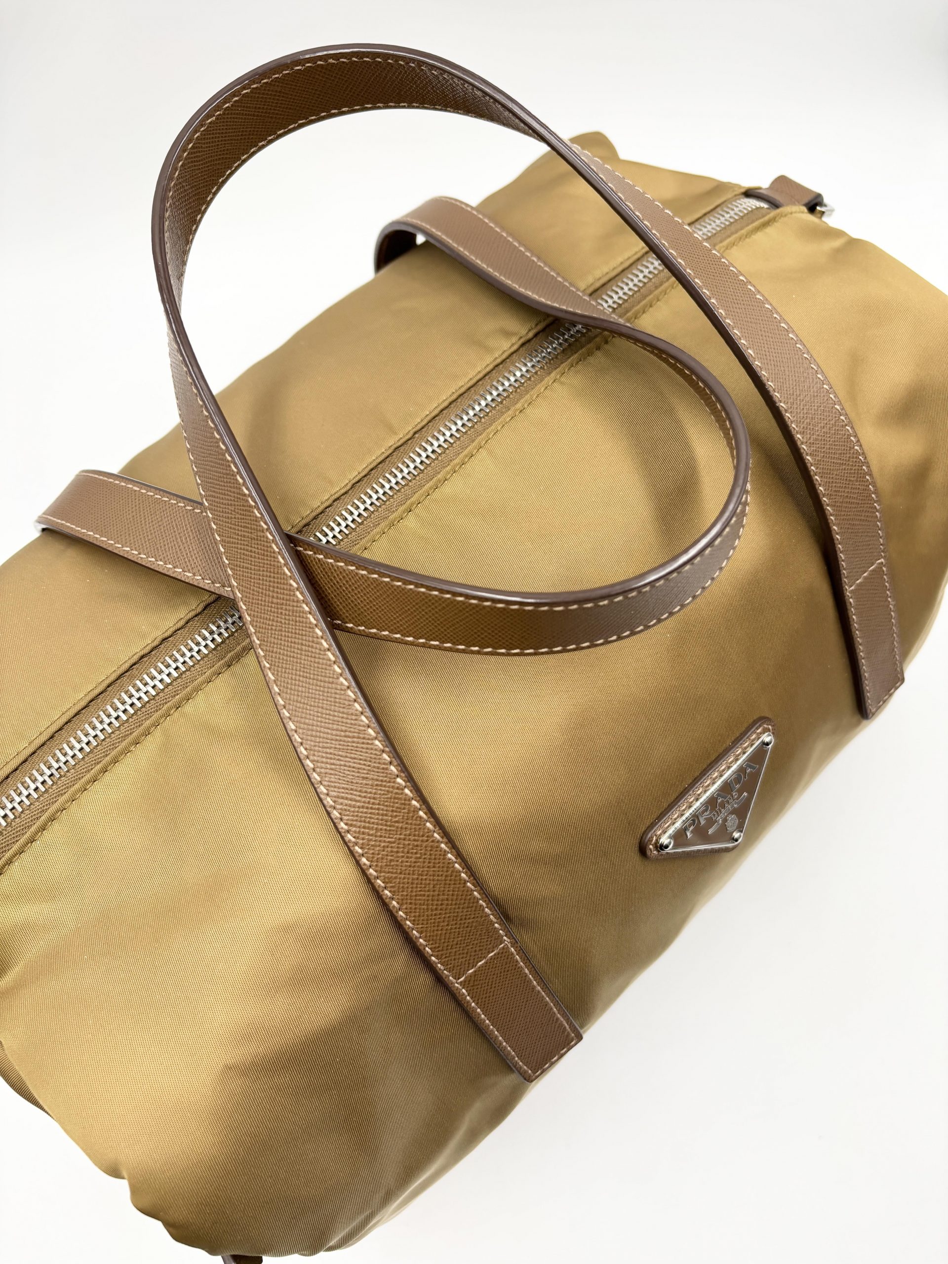 PRADA bauletto in tela vela color caramello con dettagli dei manici e tracolla in pelle saffiano