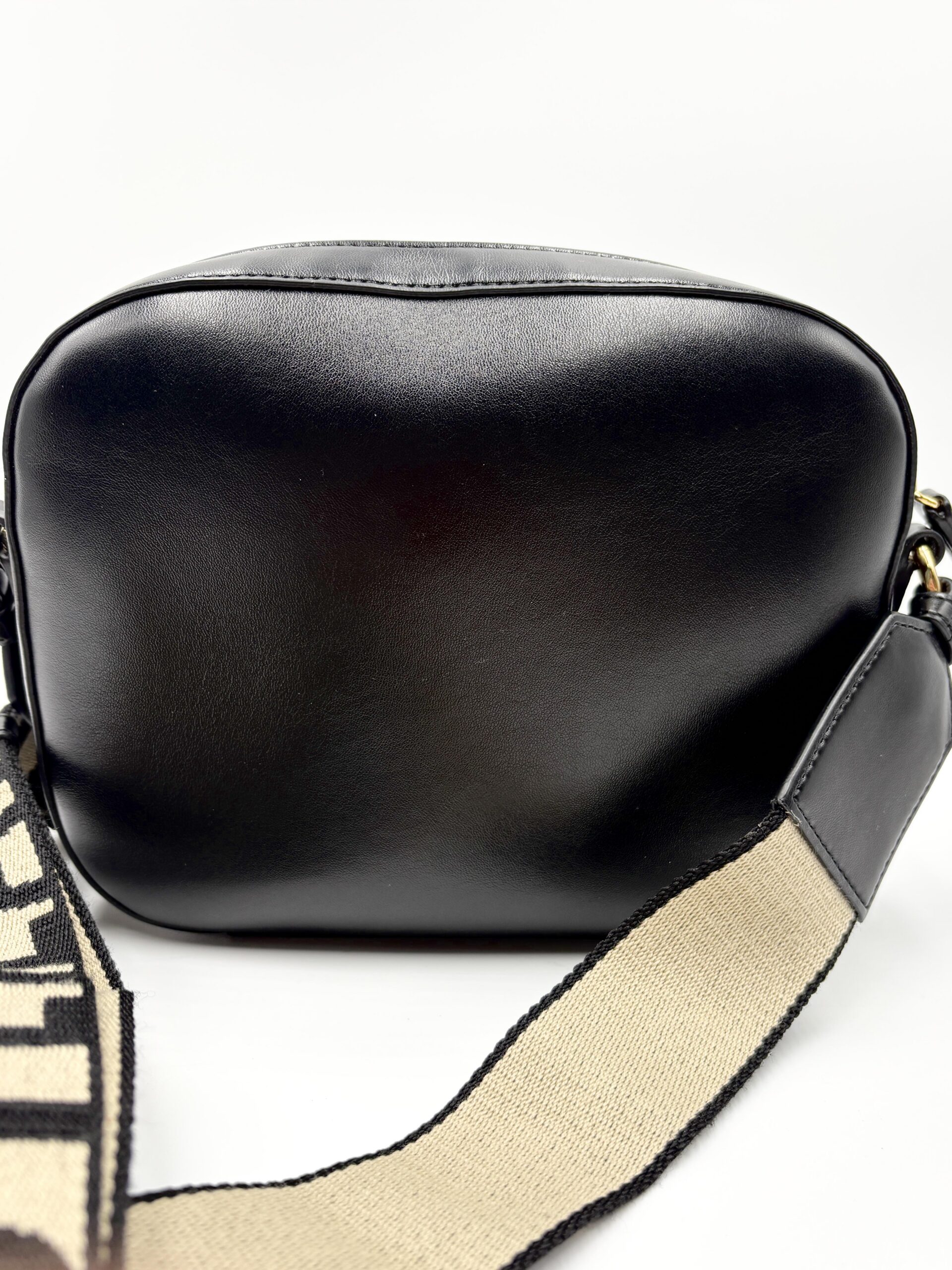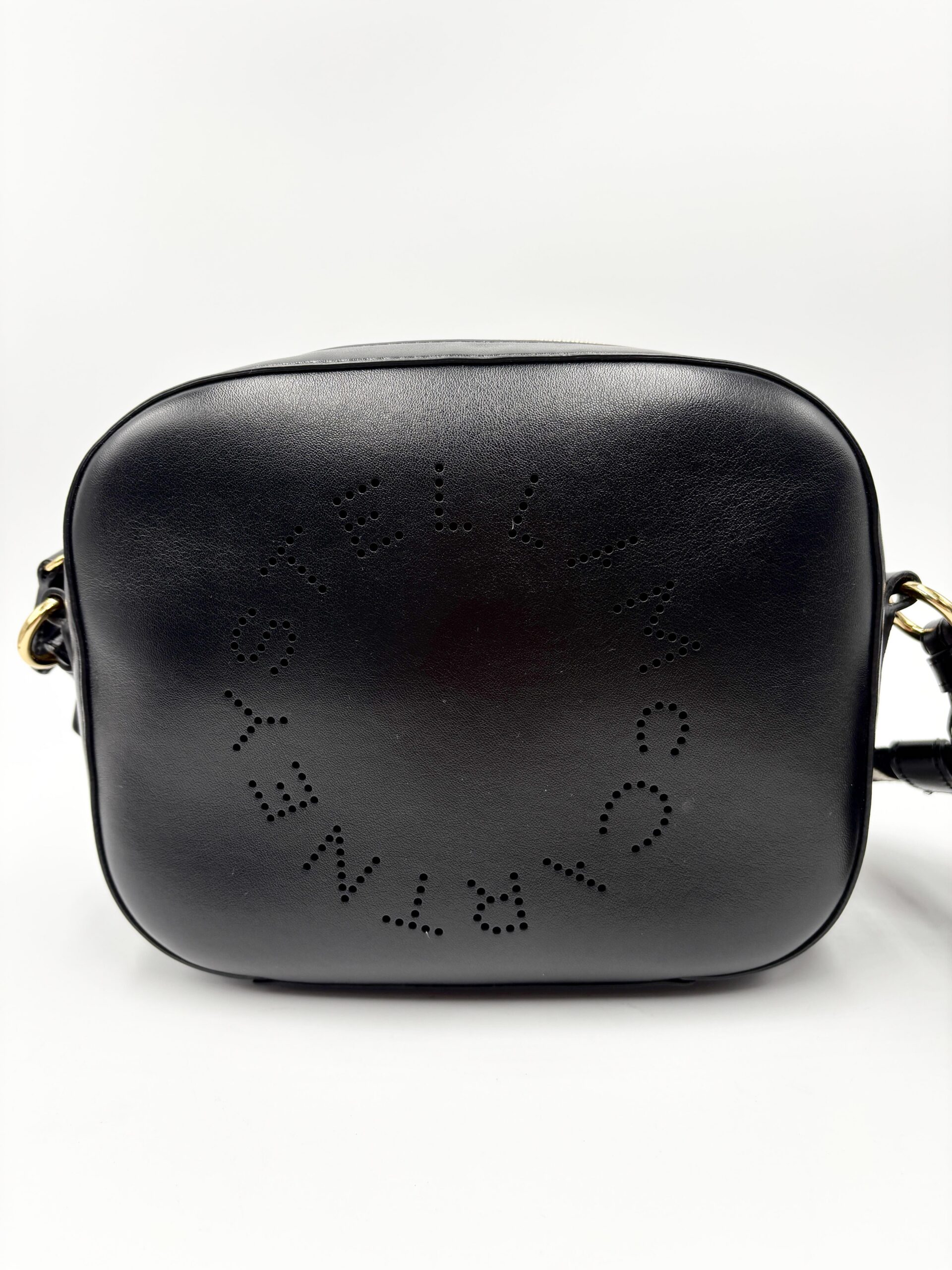 STELLA MC CARTNEY camera bag in simil pelle con maxi logo traforato e tracolla in tessuto logata
